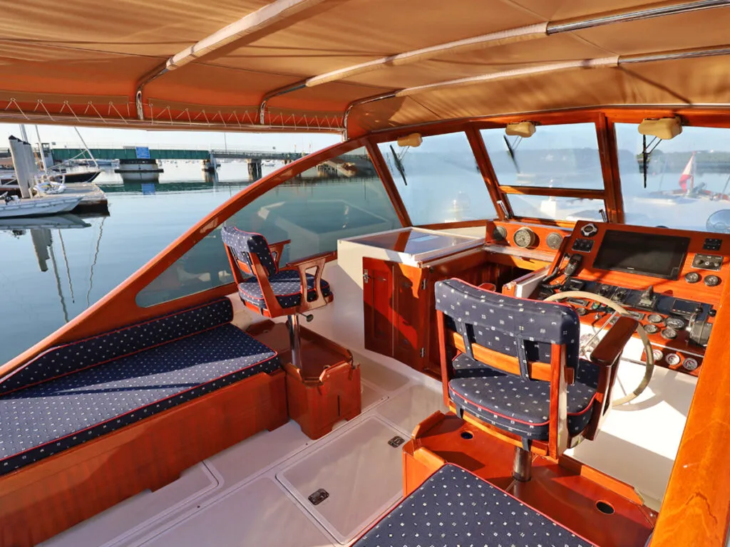 The pilot house of the Duchy 27 offers both helm and companion adjustable seating, complemented by opening hatches and side windows for excellent light and 360-degree visibility. The helm is fully equipped with modern engine controls, gauges, navigation instruments, and conveniently located 12-volt DC switches. Designed for navigating the challenging conditions of the English coastline, the pilothouse offers excellent protection and security, ensuring a smooth ride in any weather.
