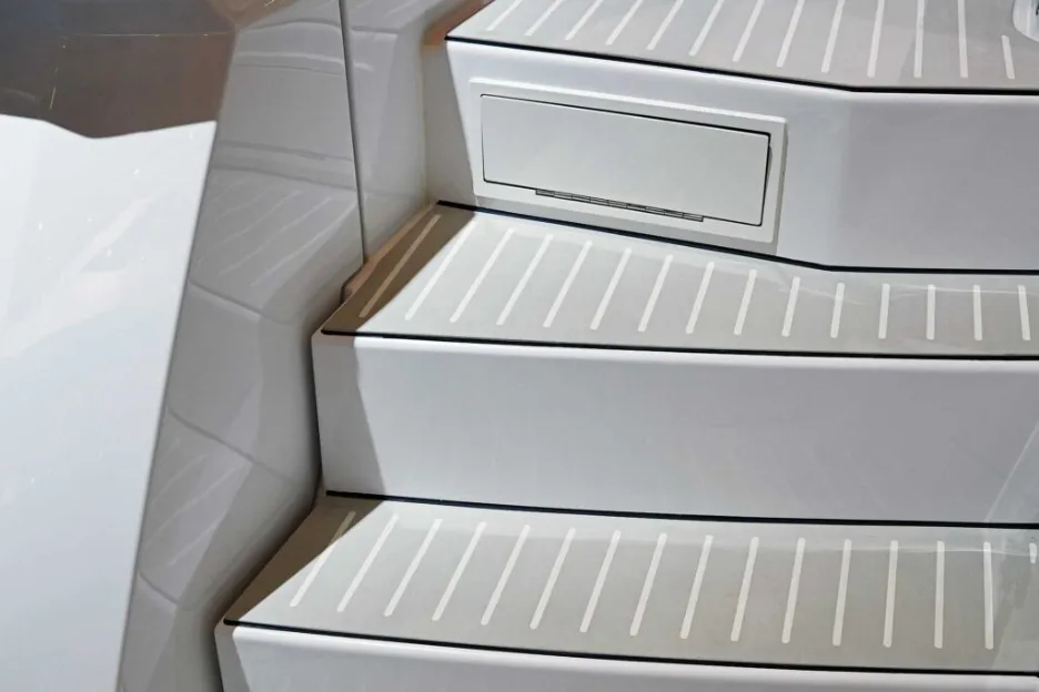 The synthetic teak decking, which includes the side decks, cockpit sole, swim platform, and coaming caps, gives the yacht a traditional aesthetic while maintaining low-maintenance practicality. Inside, the solid paneled cabinetry, dovetail-jointed drawers, customized storage solutions, and expertly finished wiring and plumbing highlight the superior level of craftsmanship. Additionally, the structural hull matrix ensures durability and strength.