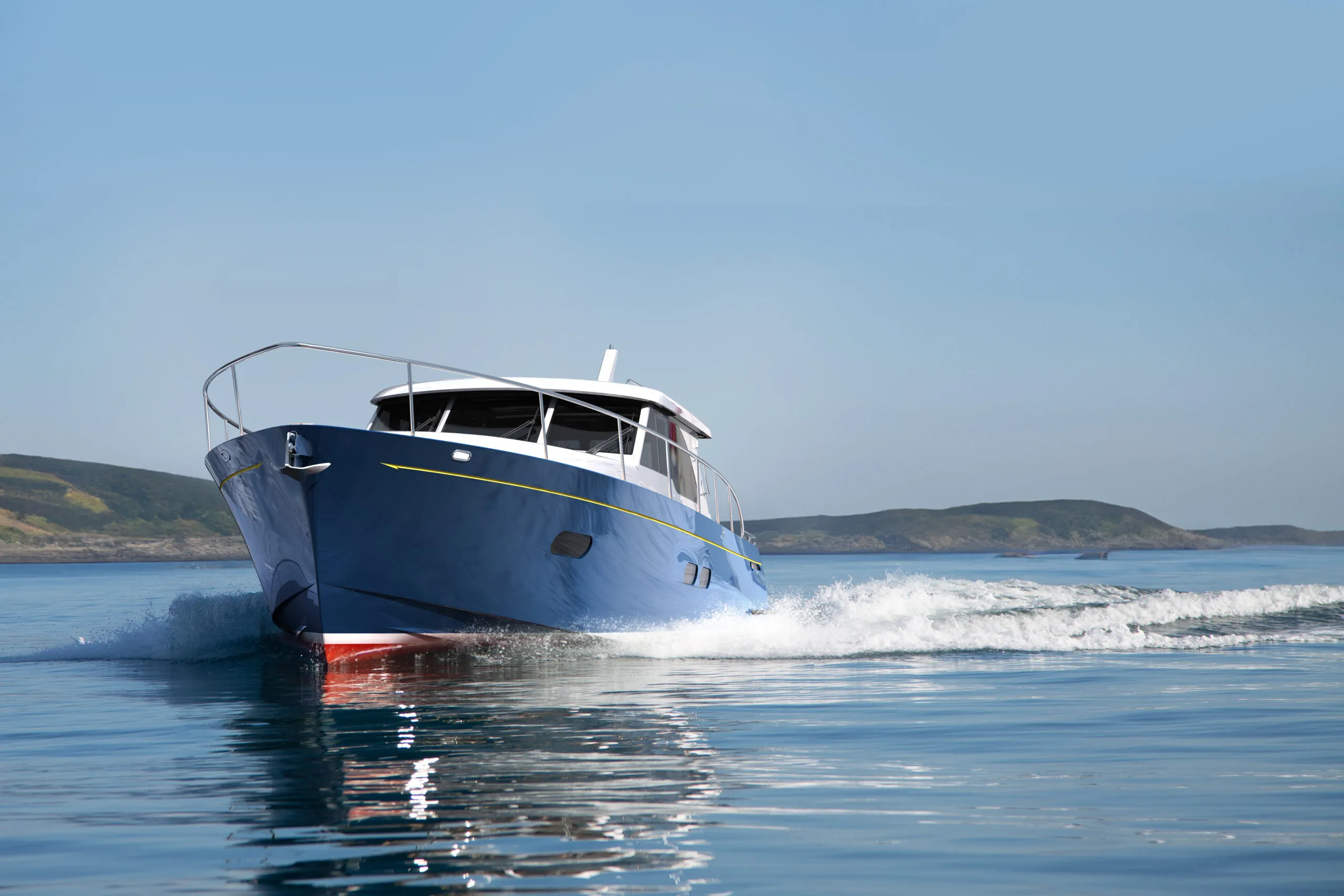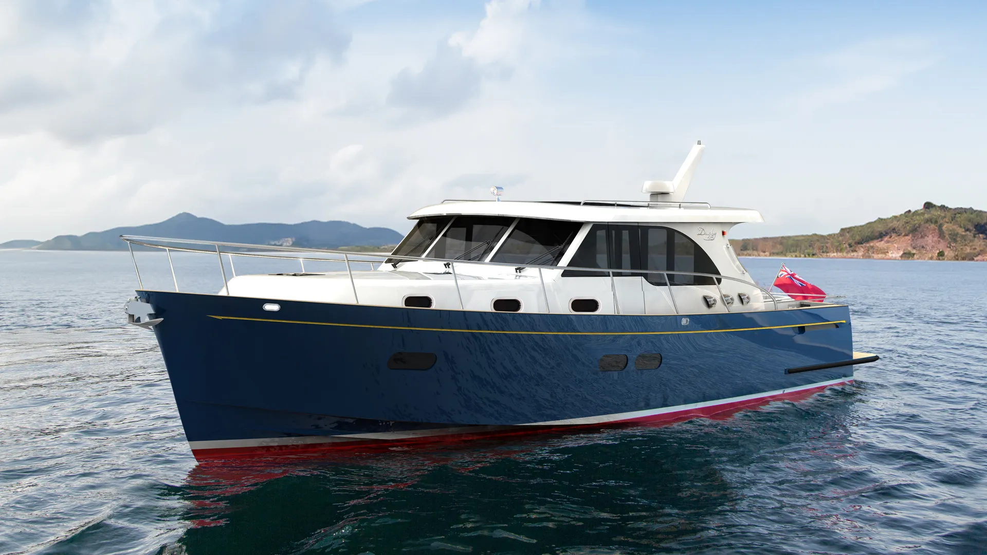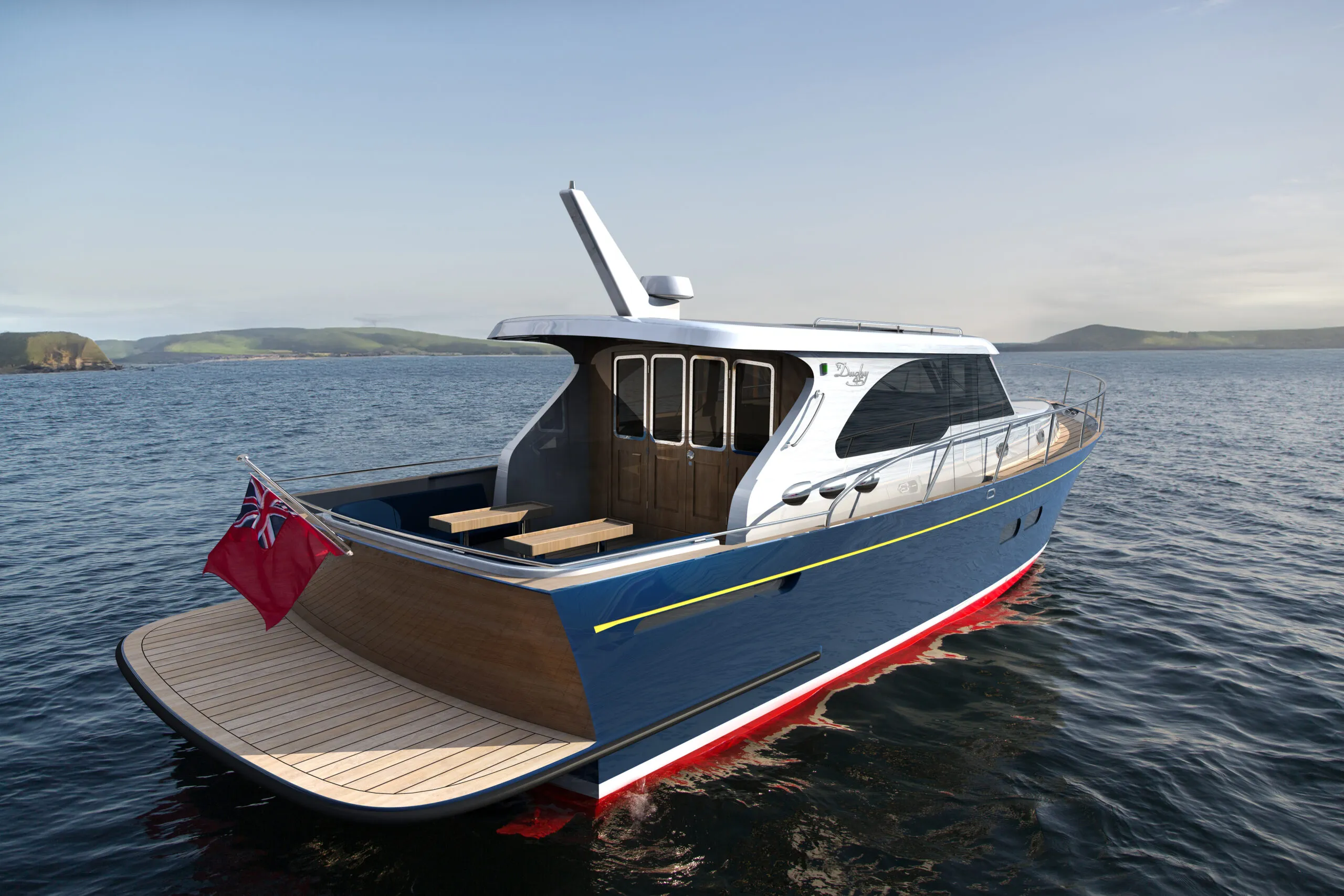 We are excited to introduce the latest addition to the Duchy line of motor yachts – the Duchy 45. Designed by esteemed British naval architect Andrew Wolstenholme, the Duchy 45 is a modern take on the traditional Downeast yacht which features a stylish wheelhouse, handsome shearline, tumblehome aft, a hard chine hull, and deep bow sections forward to safely and comfortably handle the most challenging conditions while maintaining excellent seakeeping capabilities. Both IPS and shaft drive options are available with a projected top speed of 32 knots.