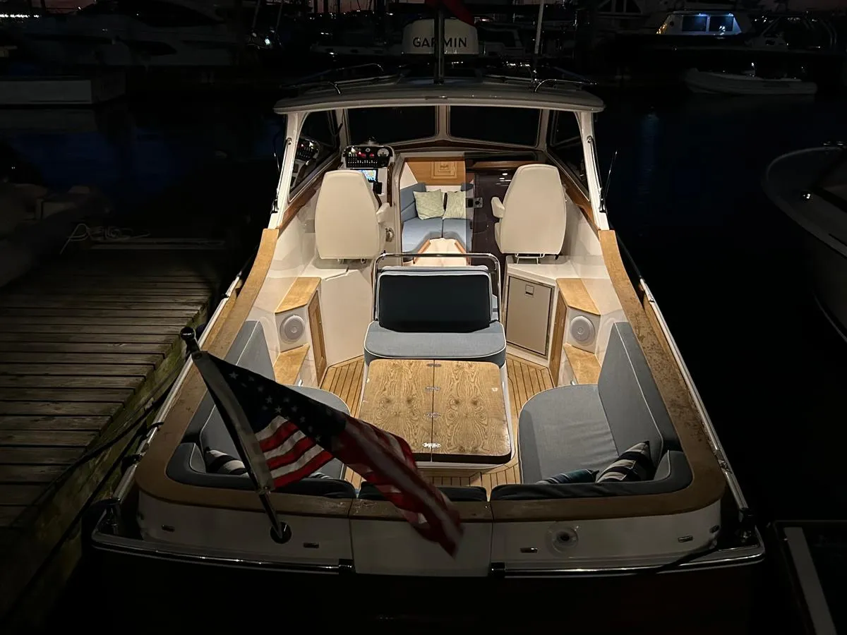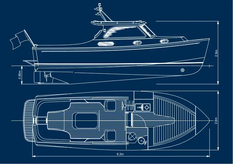 The Duchy 27 is a sophisticated and capable day boat, offering comfortable seating for six, an expandable varnished table in the cockpit, additional seating with a backrest on the engine box, and helm and companion seating. On-deck features include refrigeration and a cleverly designed transom door/step leading to a spacious swim platform with a shower. Built-in steps with multiple handrails and a bow rail ensure safe access to the foredeck, where twin bow rollers and an anchor windlass make picnics and mooring effortless.
