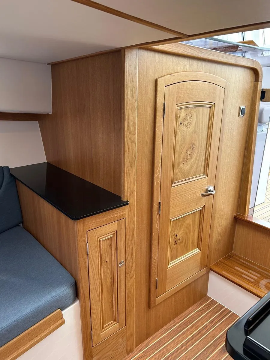 The pilothouse offers both helm and companion adjustable seating, with opening hatches and side windows that provide excellent light, ventilation, and 360-degree visibility. Engine controls, gauges, navigation instruments, and all 12-volt DC switches are conveniently located at the helm. The pilothouse provides security and protection, designed to handle the challenging conditions of the English coastline.
