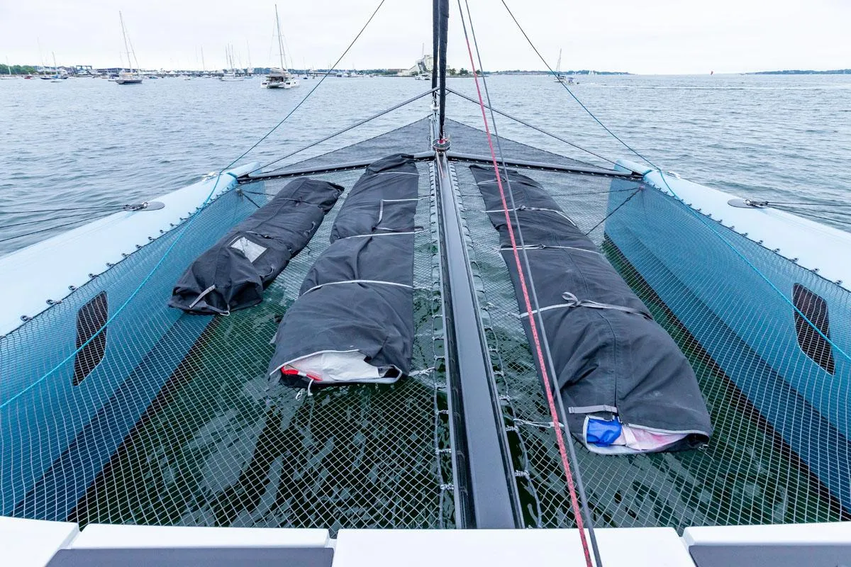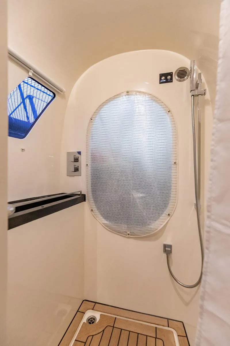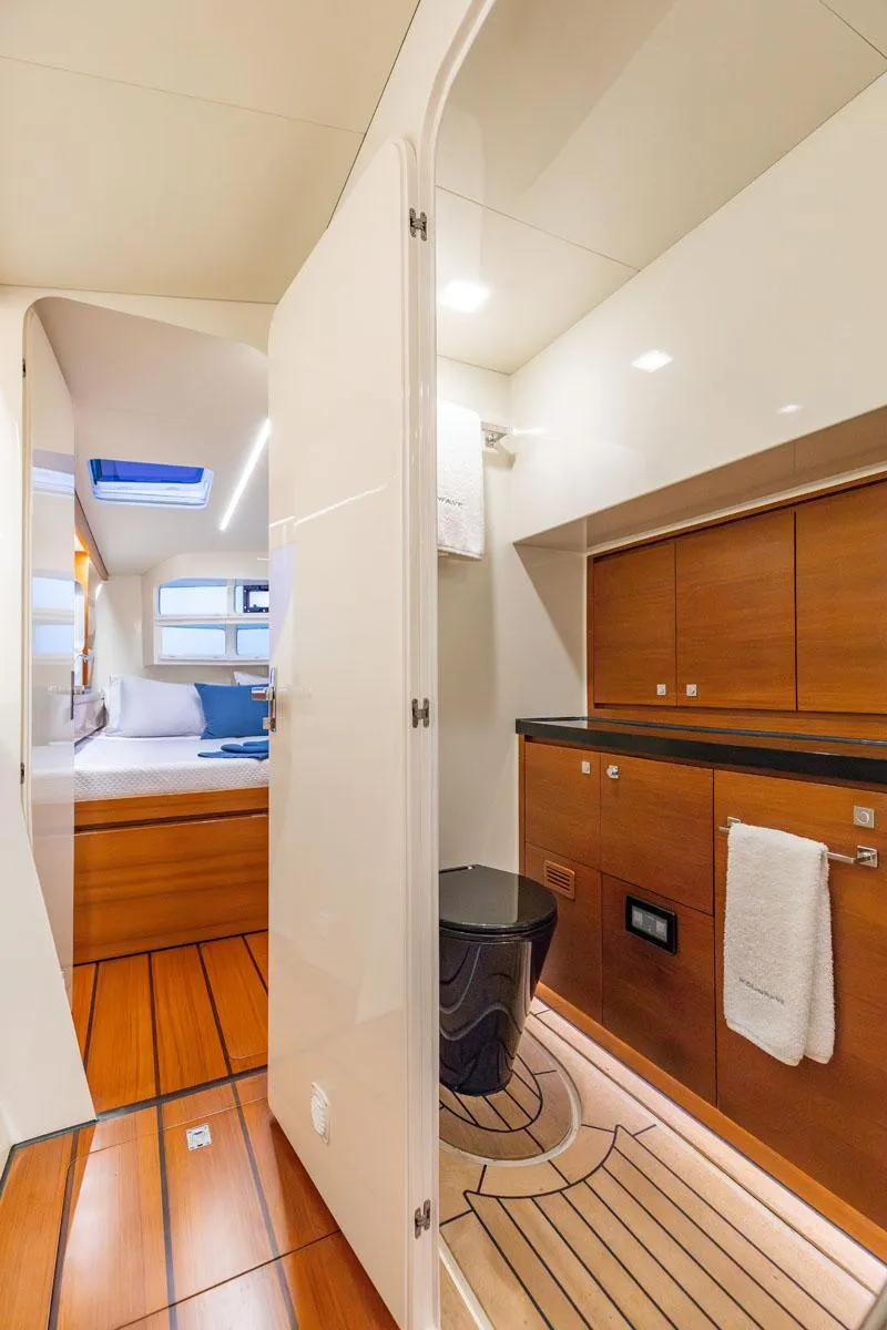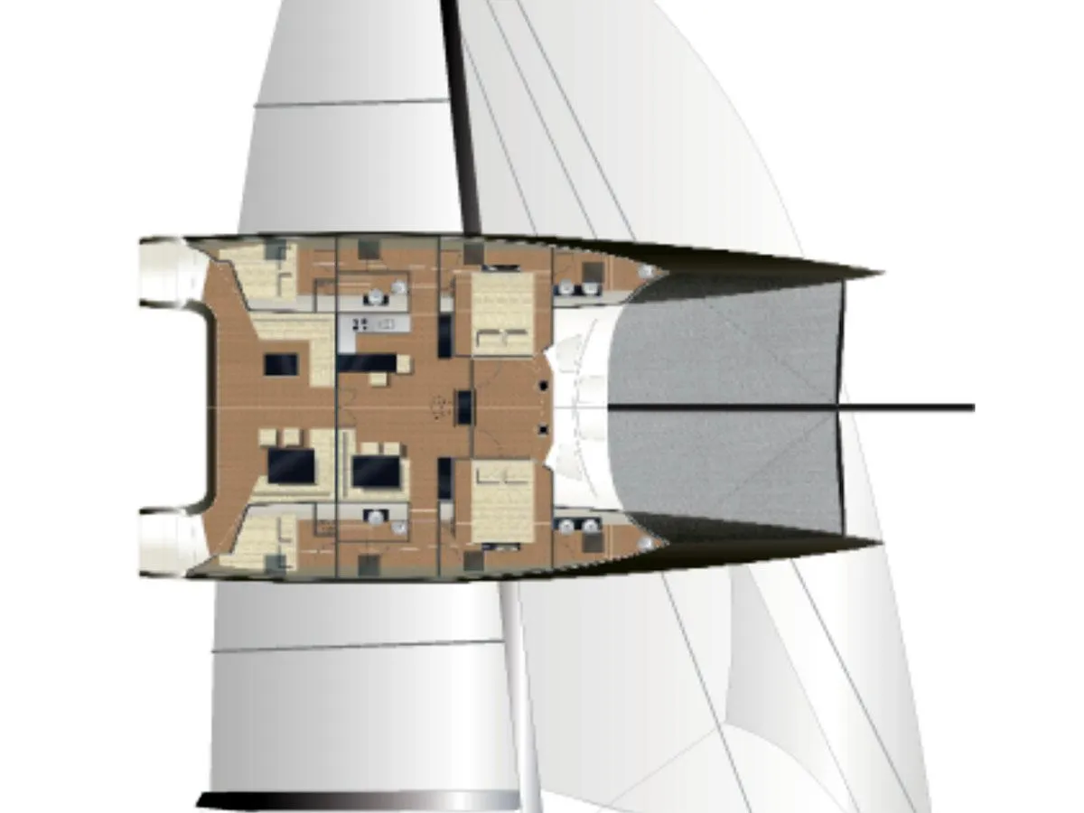 In the starboard hull there is a guest cabin aft with its own private (detached) head amidships. The owner’s suite is forward, with a spacious ensuite head and shower.