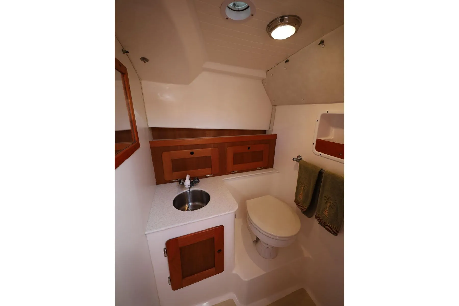 There is a large, enclosed ensuite head and shower aft to starboard with hot and cold pressured water shower and electric push button saltwater toilet. There is a Corian counter with recessed stainless sink and hot and cold pressured water, overhead solar vent and tank tender indicator. There are outboard cherry wood faced storage cabinets, wall mirror and an opening flush mount aft bulkhead cabinet door to access the back side of the helm dash electronics and controls.
