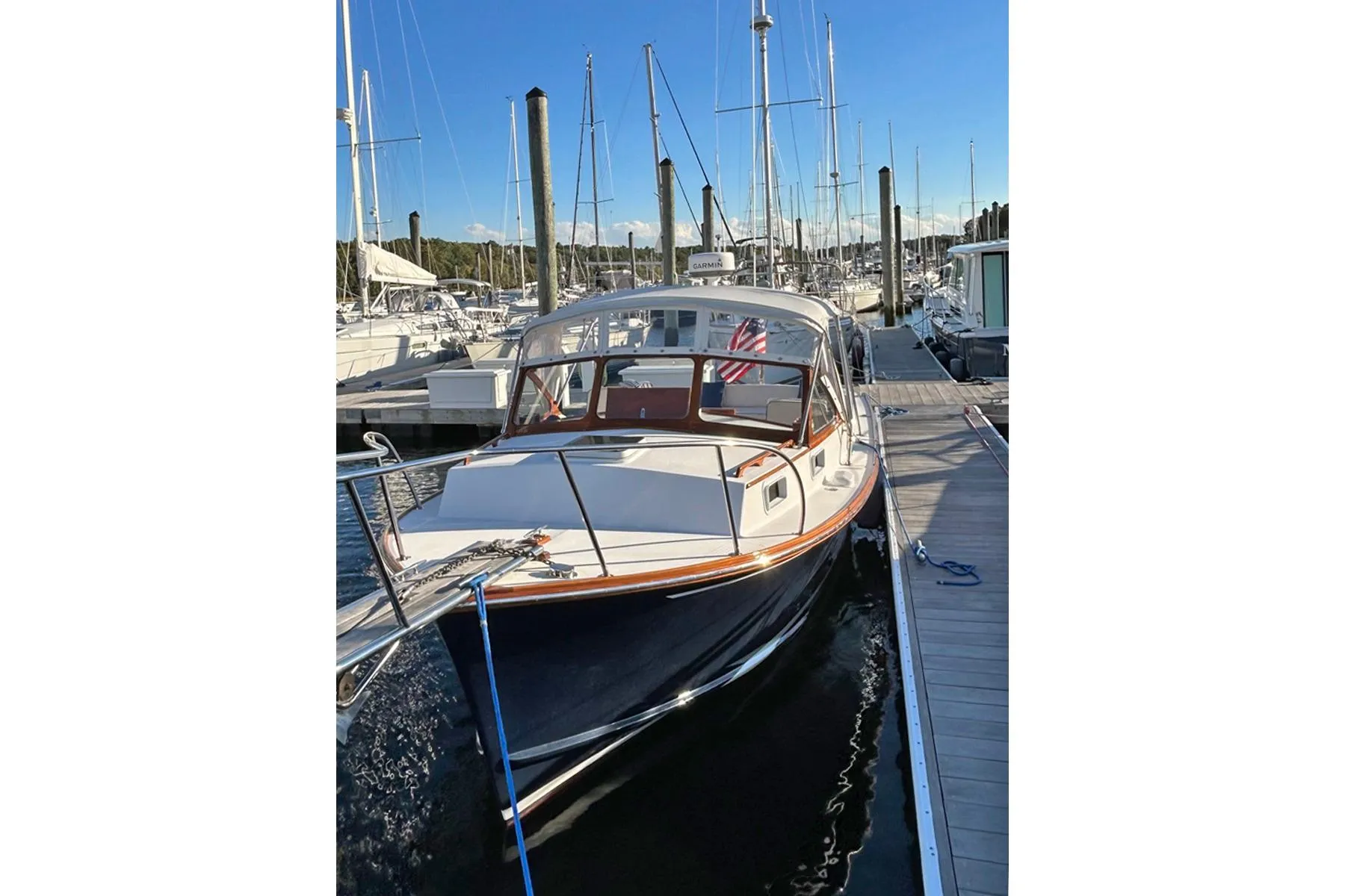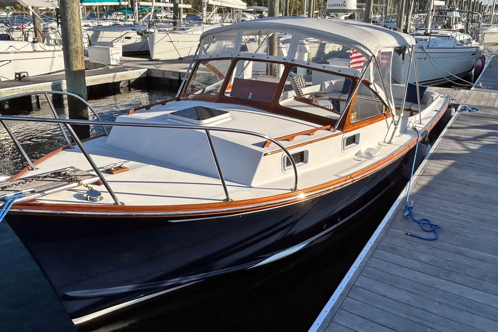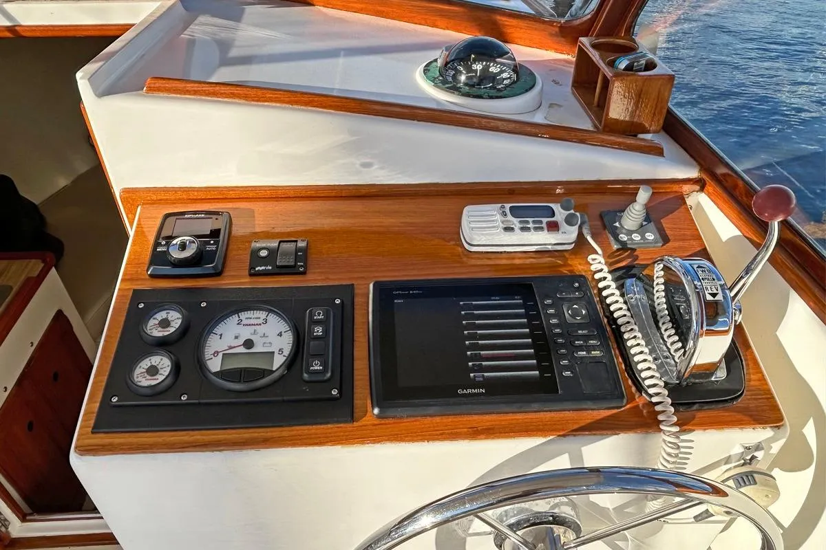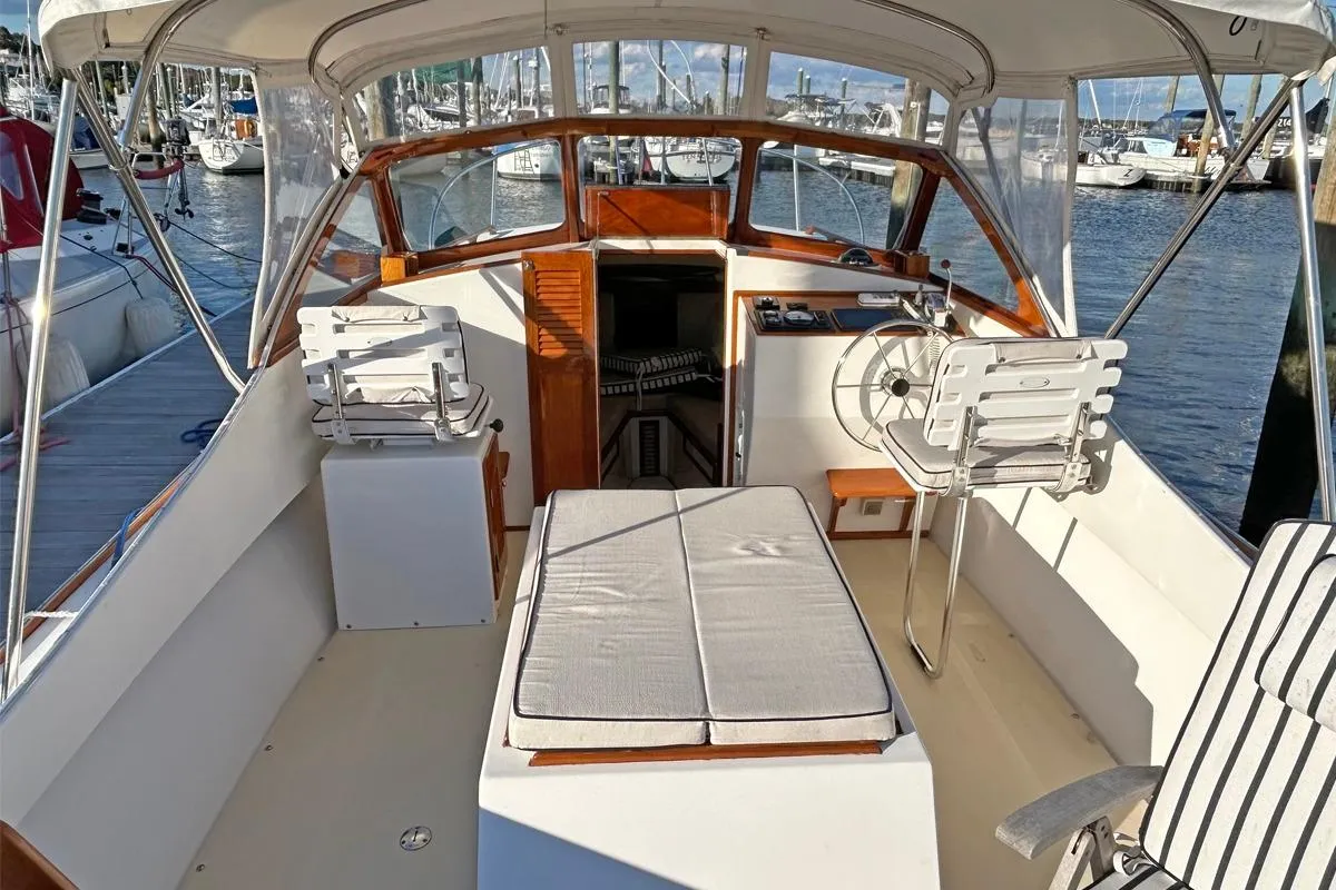 - Varnished teak windshield, handrails, cabin nosing, toe rails and cockpit trim