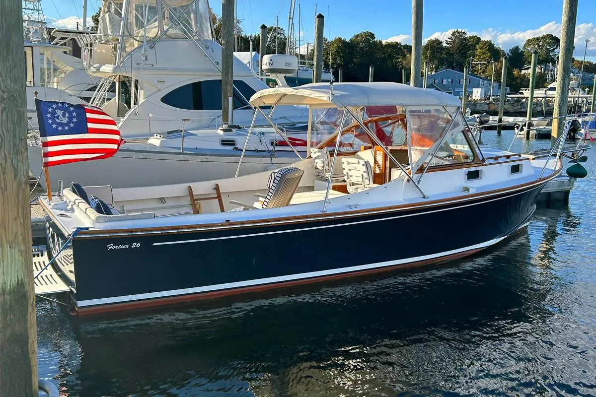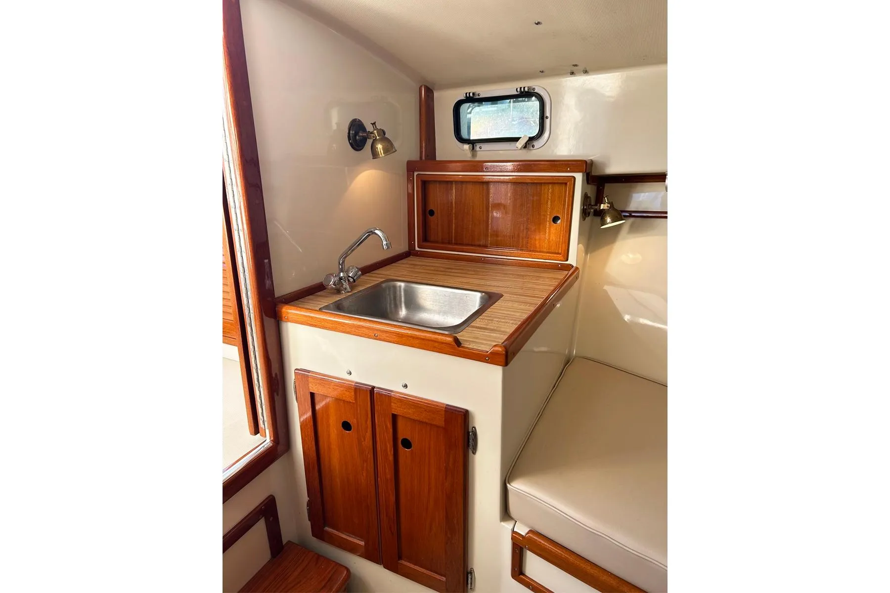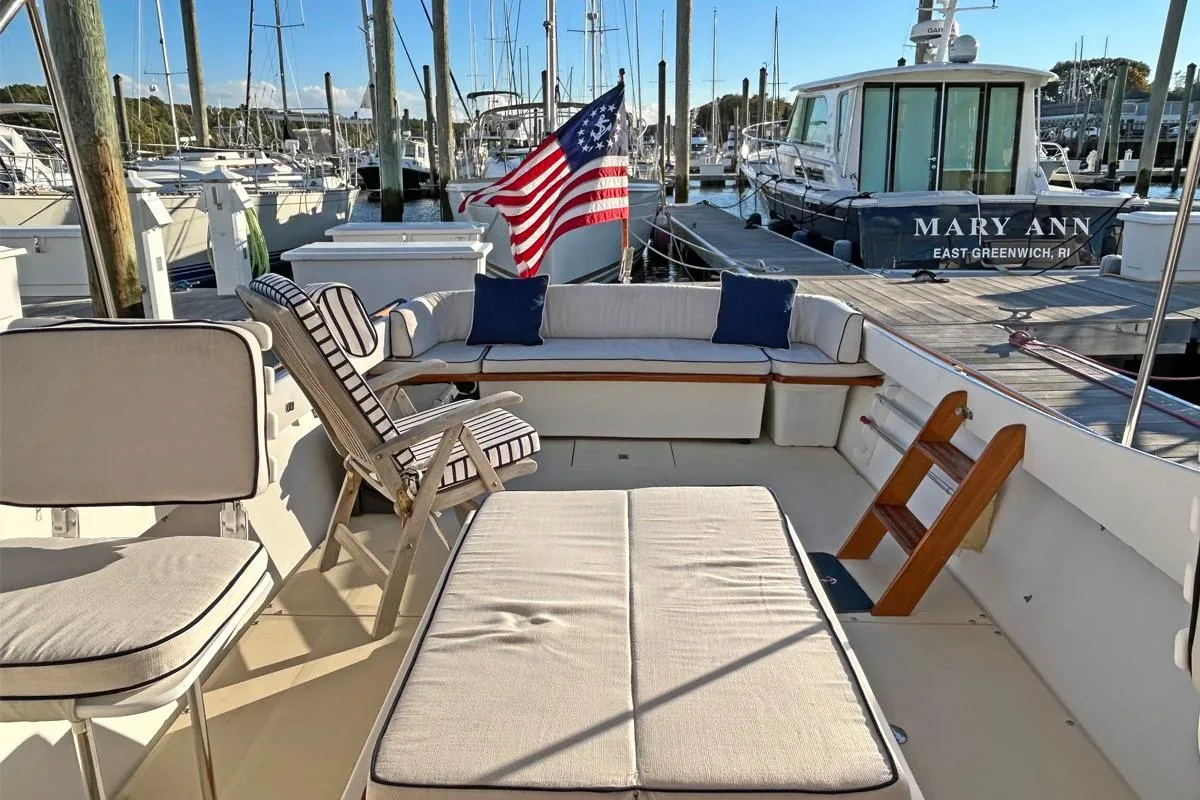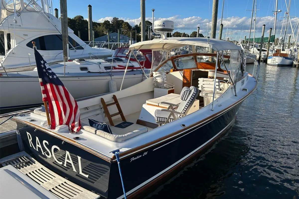 - Varnished teak windshield, handrails, cabin nosing, toe rails and cockpit trim