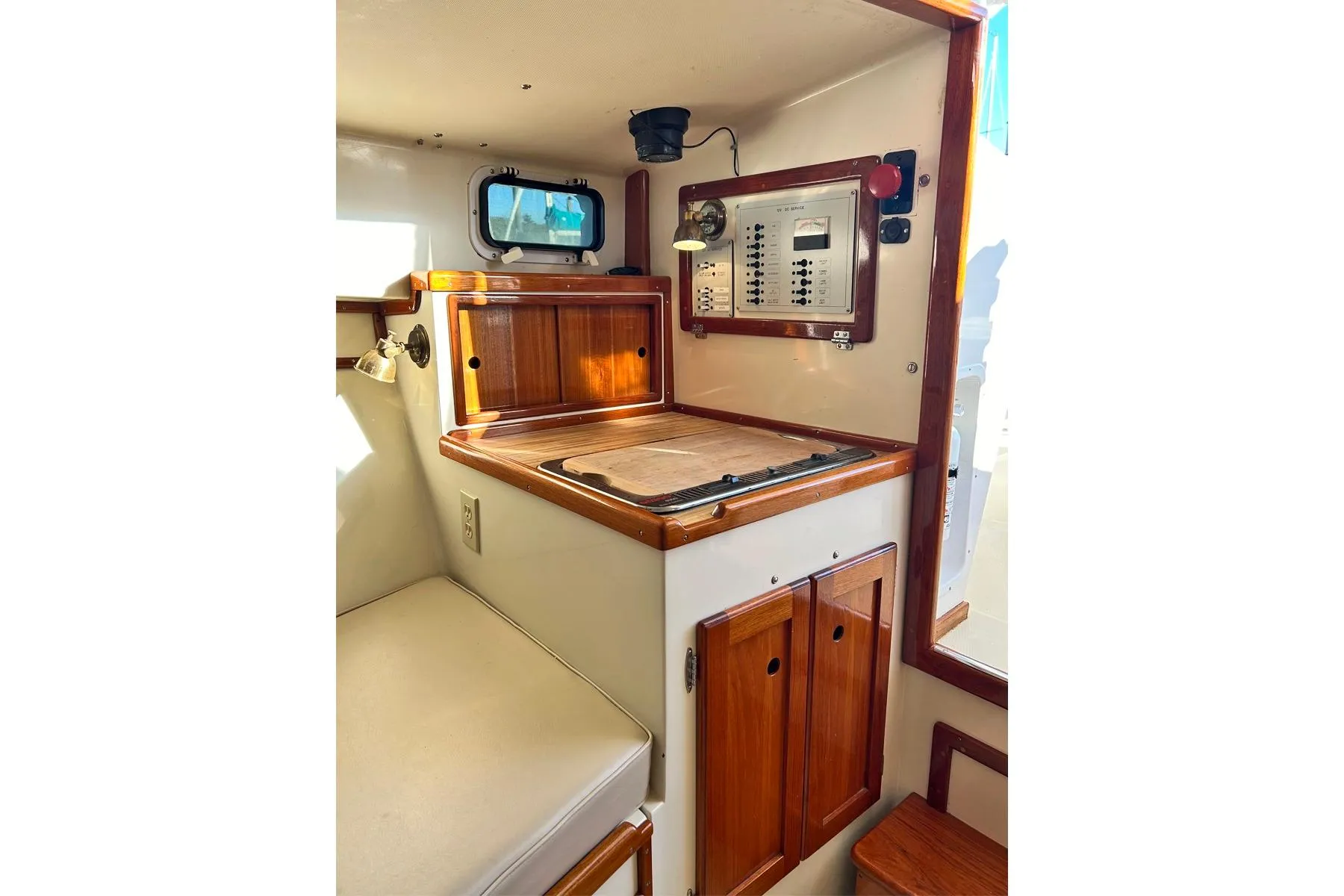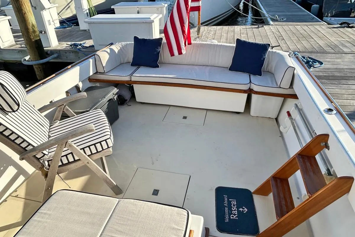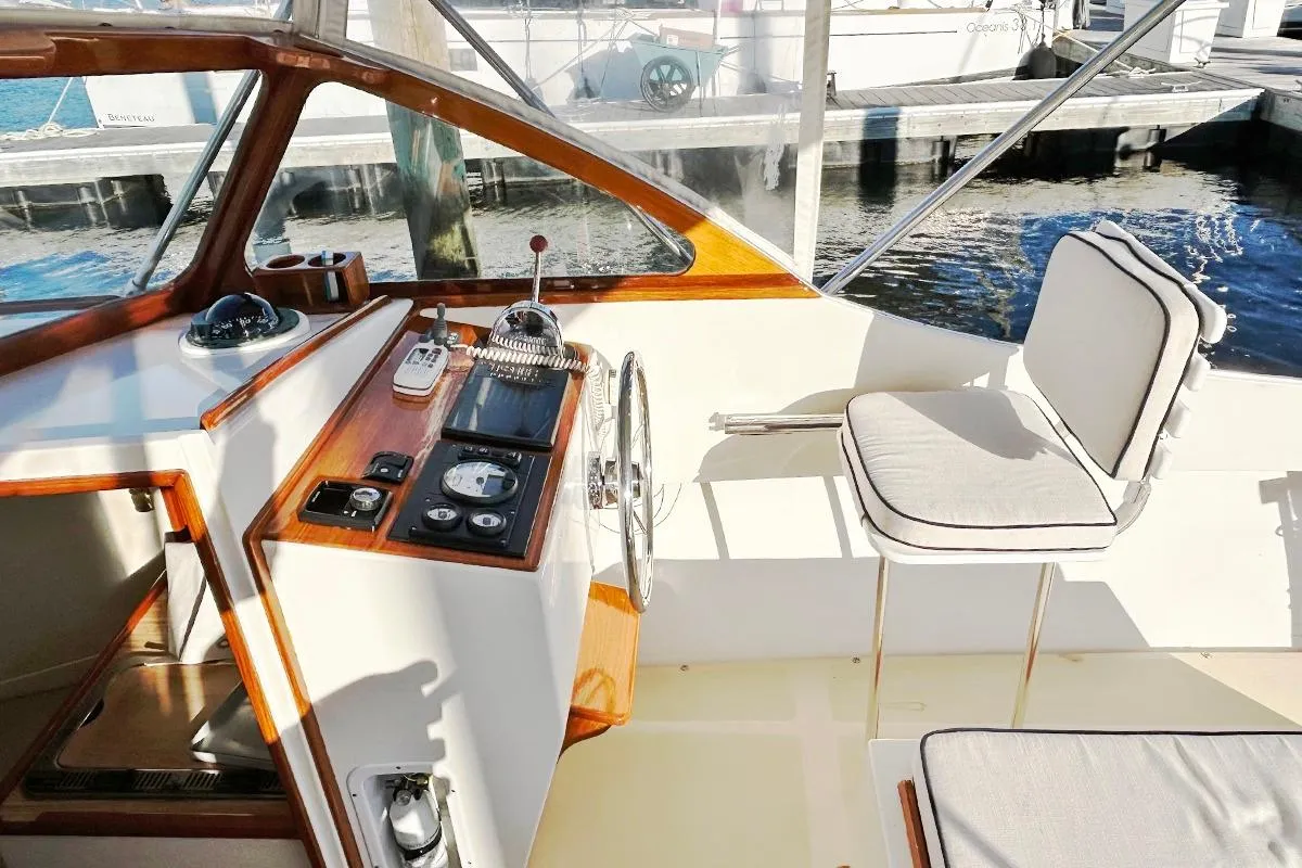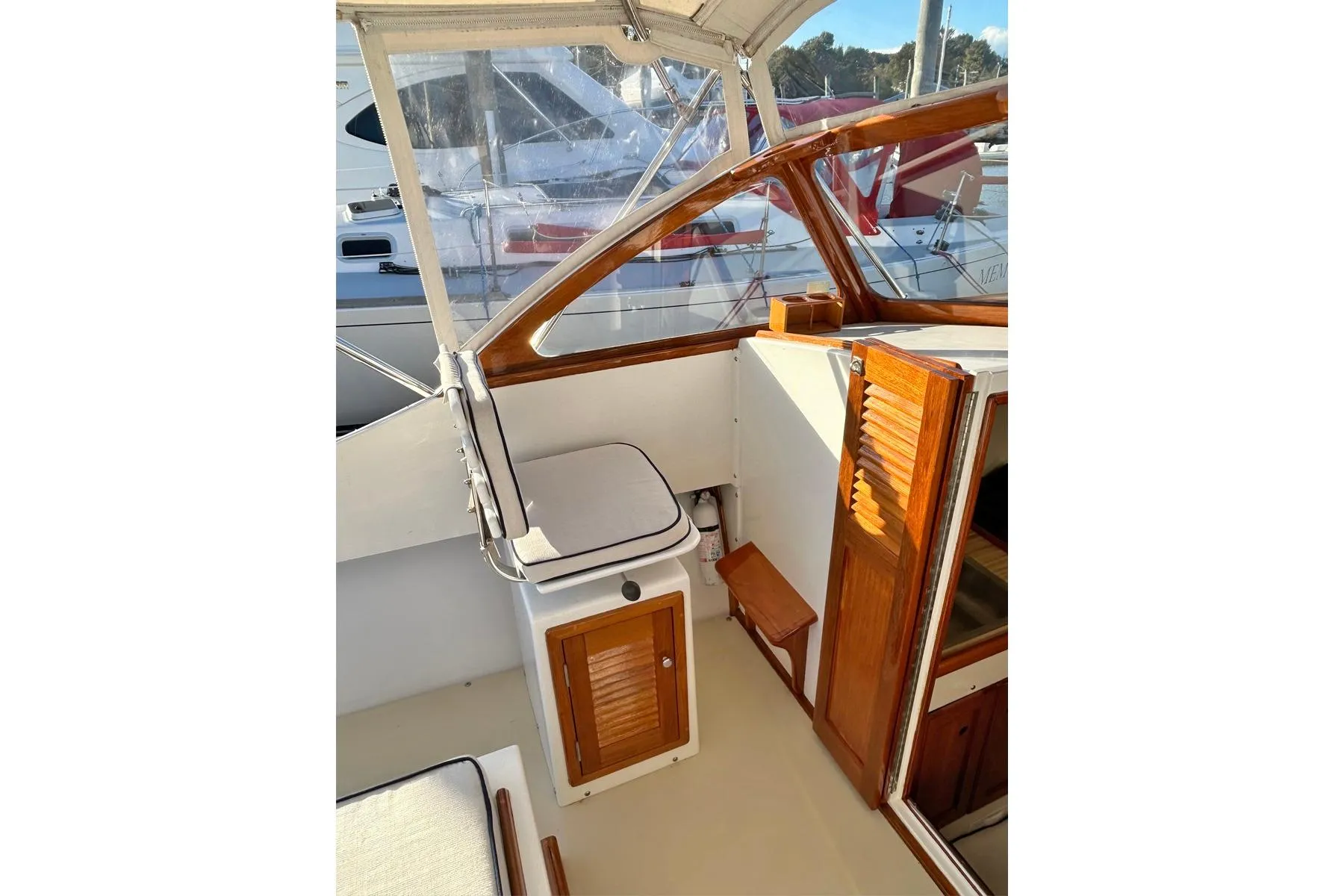 - Pompanette helm and passenger seats (new cushions 2022) with storage locker port side under seat