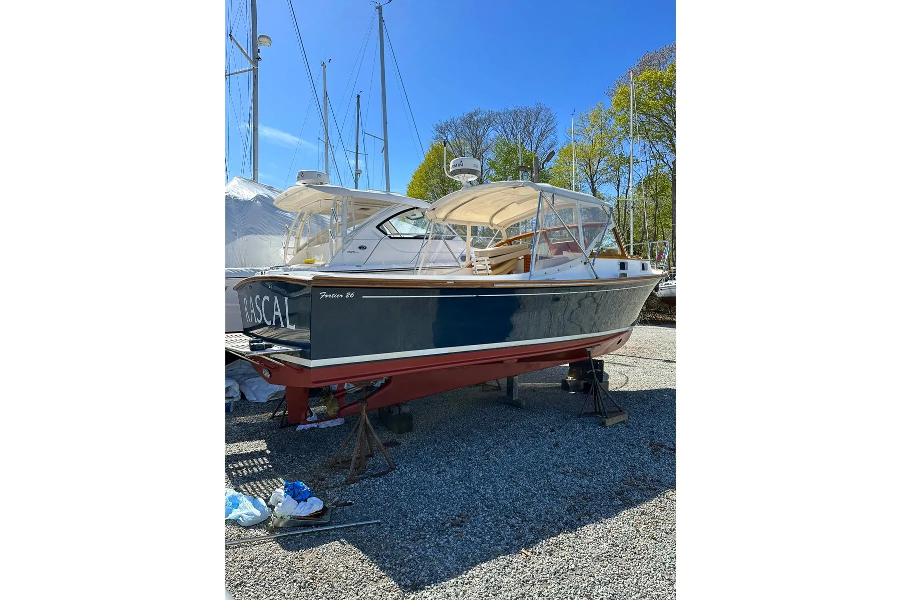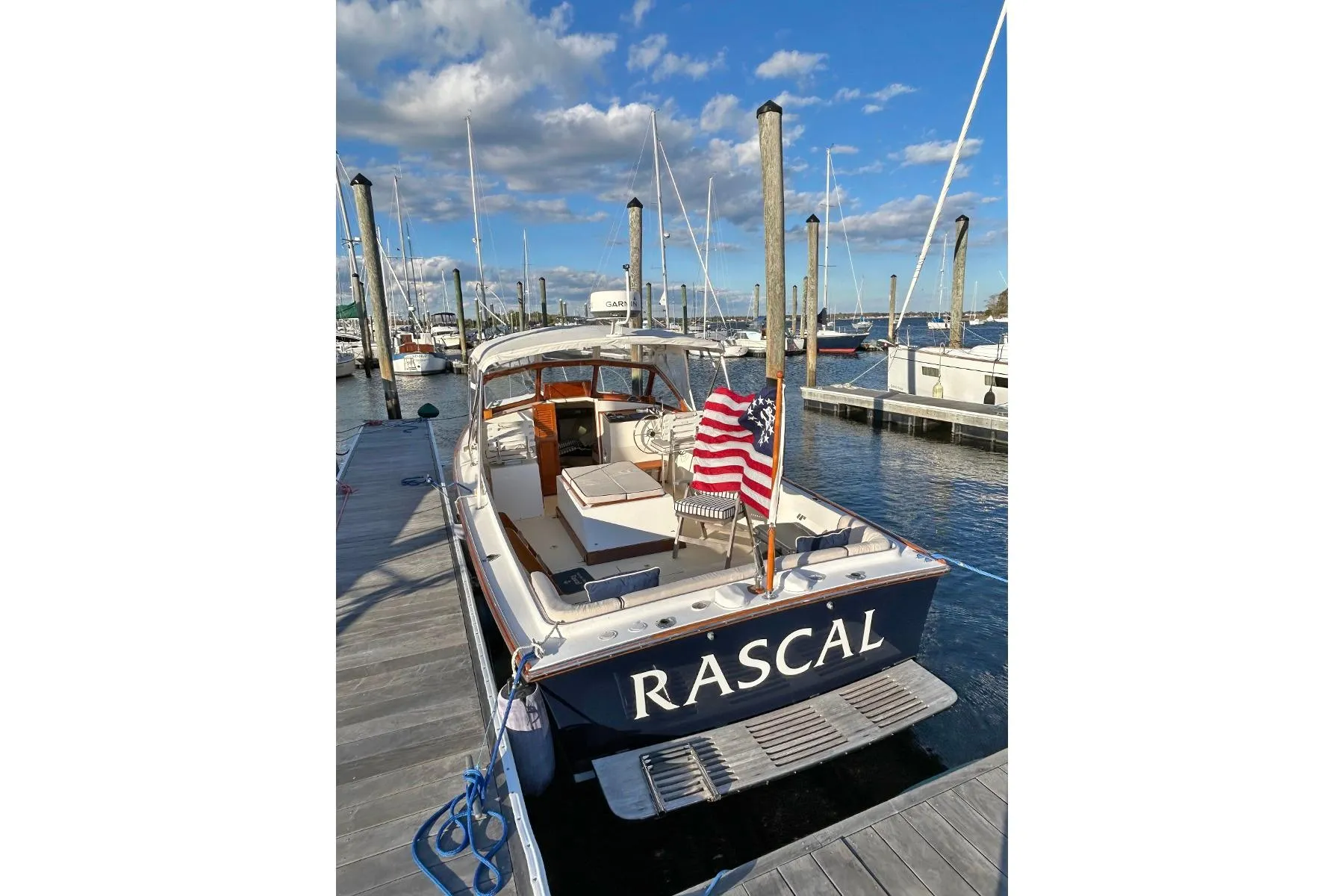 - Awlgrip Flag Blue hull (2024) with white cove stripe and boot stripe, and red bottom