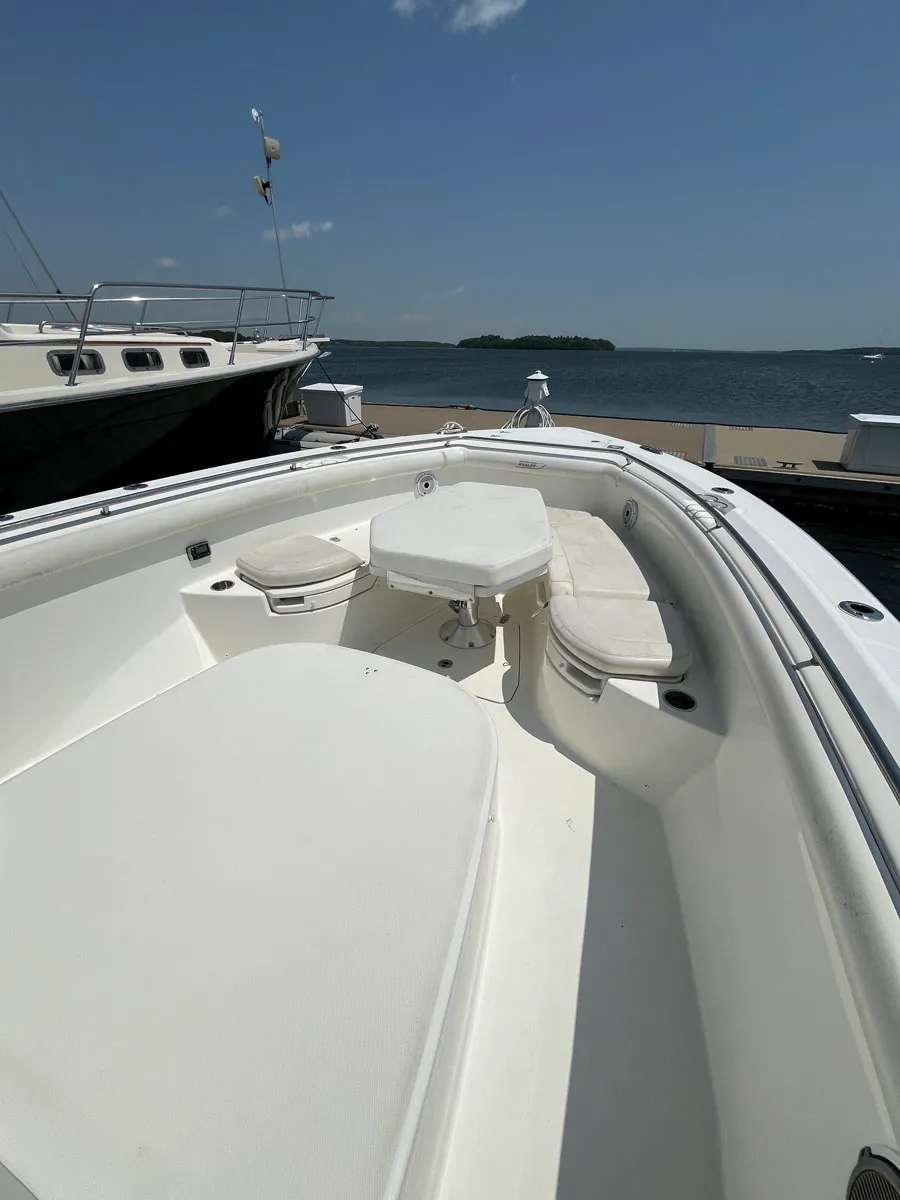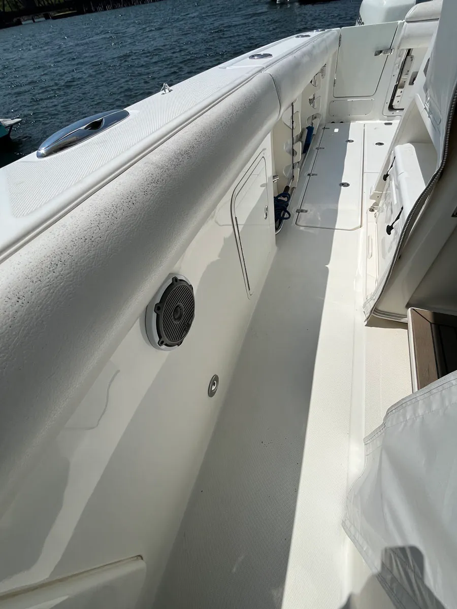 The Boston Whaler Outrage 350 is a powerful and functional fishing machine loaded with thoughtful features. It also doubles as a great family boat with enclosed head and shower, plenty of seating forward and aft, and swim/dive door.
