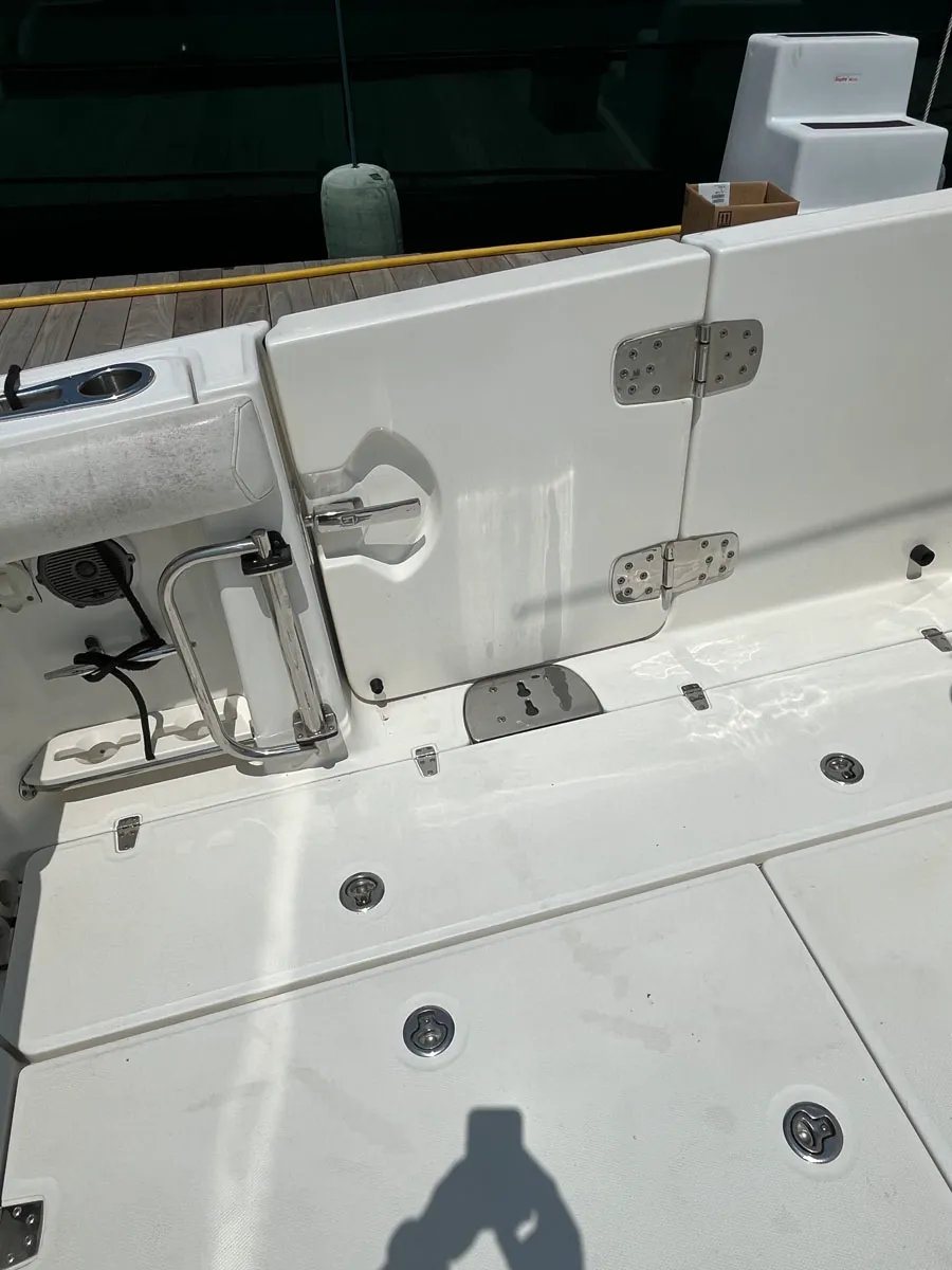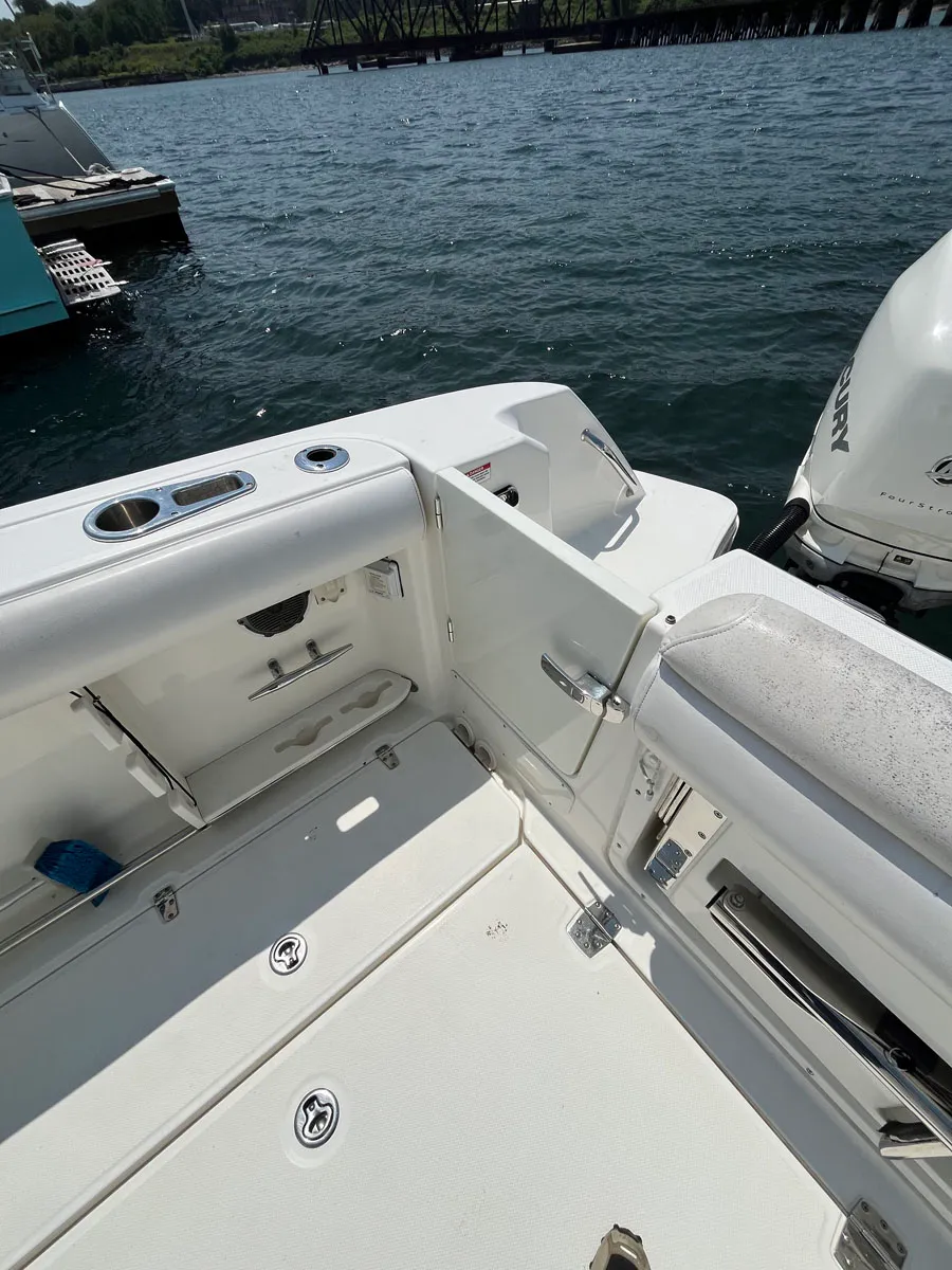 - Pressurized aerated live well (23-gal) with clear top window and blue interior in aft port corner