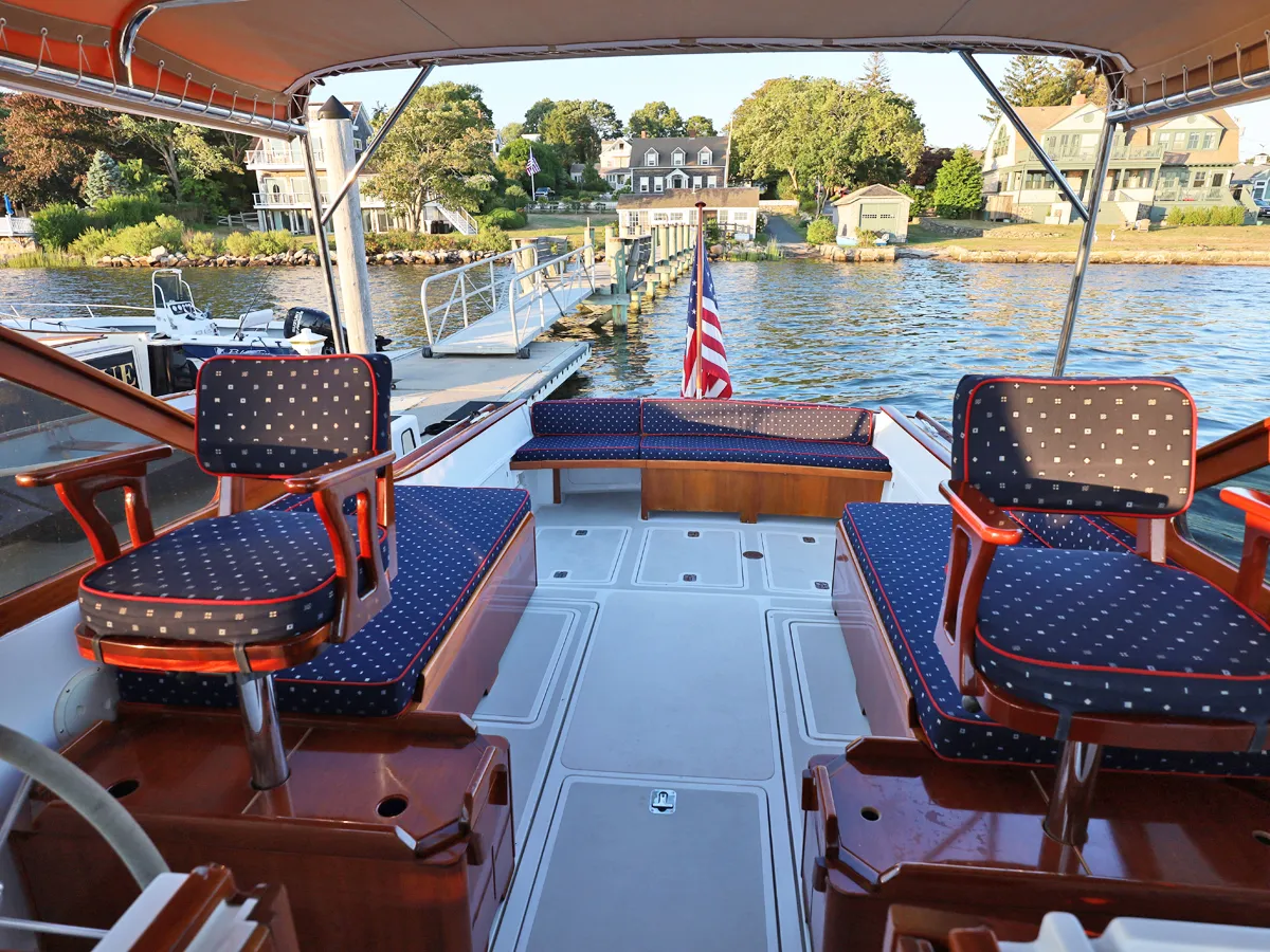 2022. Stainless handrails the length of the bimini top port and starboard for moving fore and aft on the side decks and strategically placed wood handrails on windshield. The cockpit has an athwartship transom settee with teak accents and teak ladderback with storage beneath and a removable section to access the