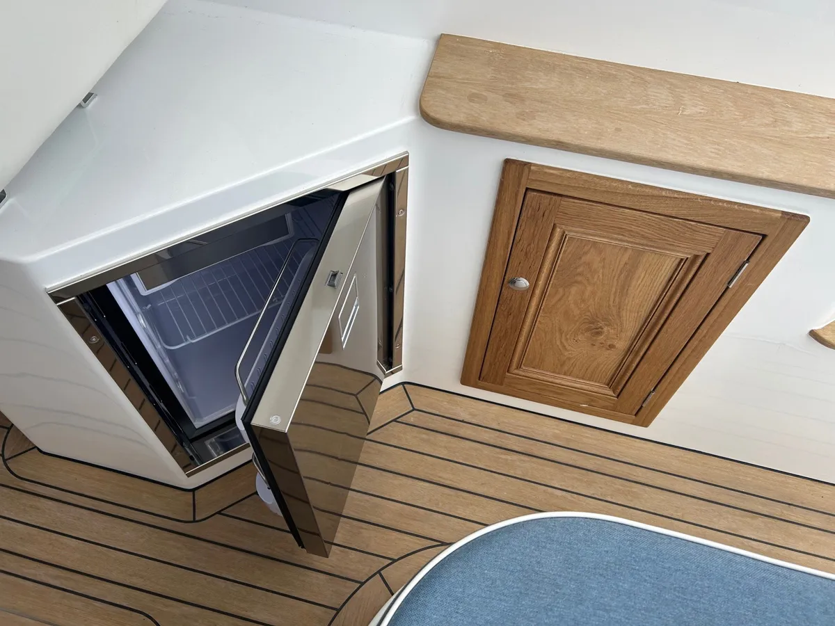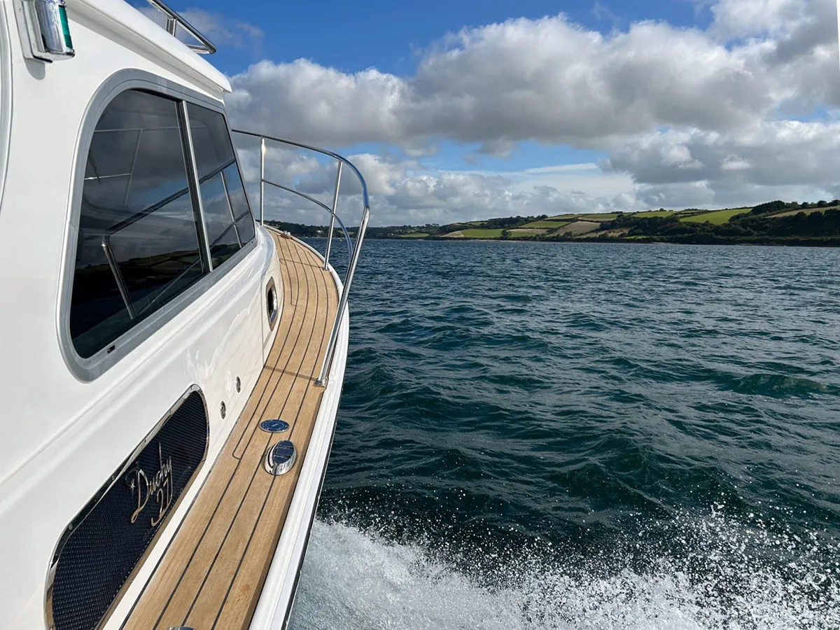The Duchy 27 is a sophisticated and capable day boat, offering comfortable seating for six, an expandable varnished table in the cockpit, additional seating with a backrest on the engine box, and helm and companion seating. On-deck features include refrigeration and a cleverly designed transom door/step leading to a spacious swim platform with a shower. Built-in steps with multiple handrails and a bow rail ensure safe access to the foredeck, where twin bow rollers and an anchor windlass make picnics and mooring effortless.