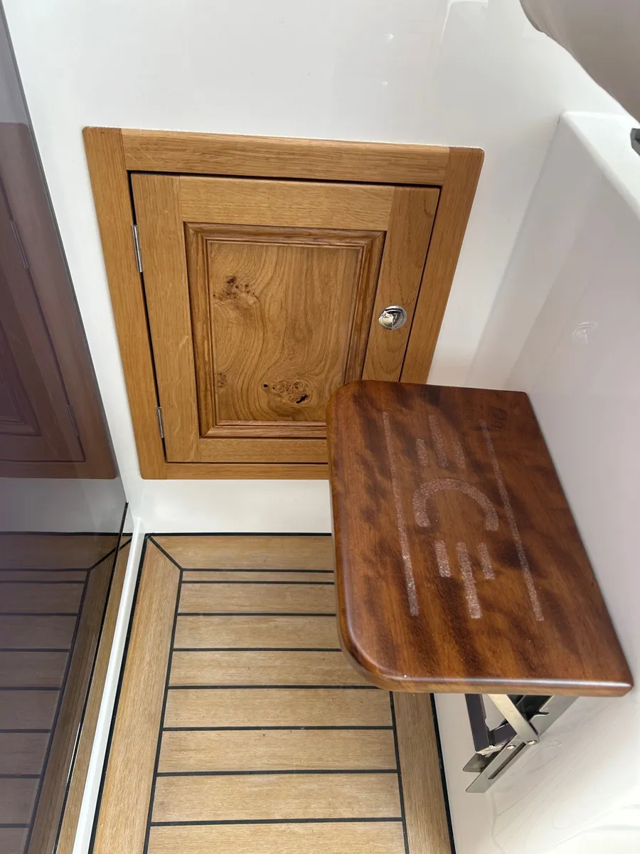 - Solid oak interior joiner work including paneled locker fronts, head door, and dovetail jointed drawers, meticulously finished in polyurethane varnish