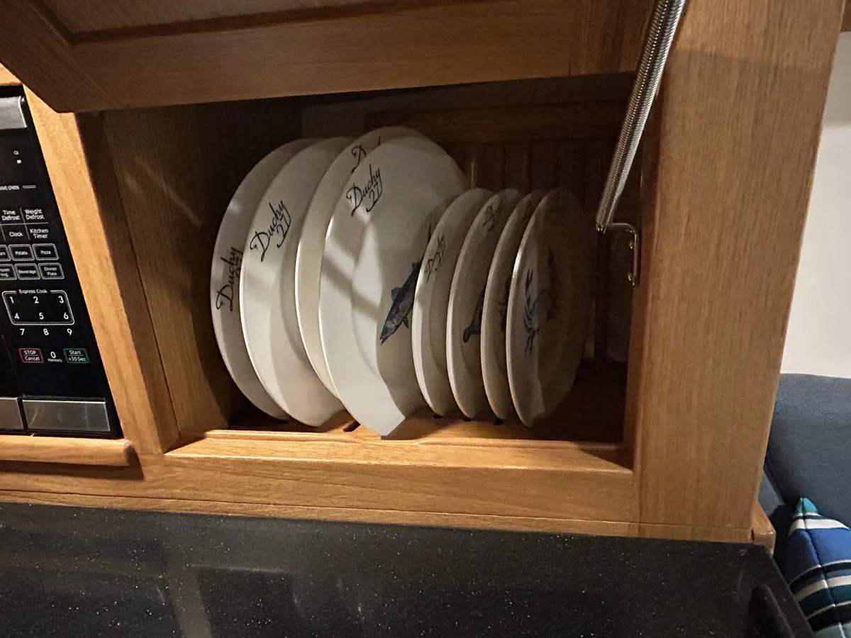 - Storage lockers above and below counter with custom storage for handmade Cornish crockery, glasses and provided cutlery