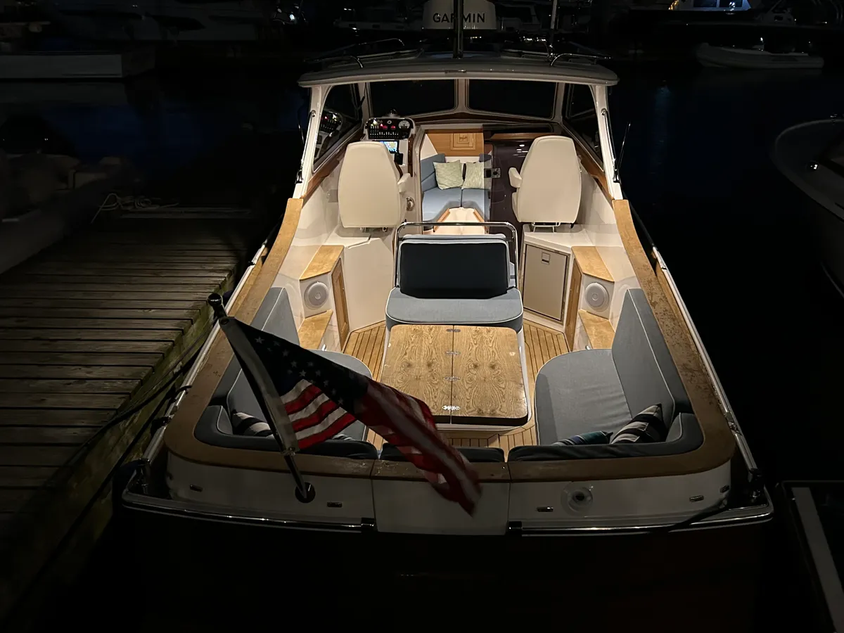 - Spacious cockpit features convenient walk-through transom leading to swim platform for easy swimming, and boarding from dock, finished with synthetic laid teak