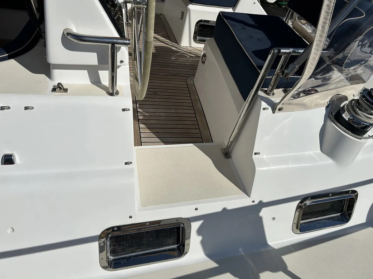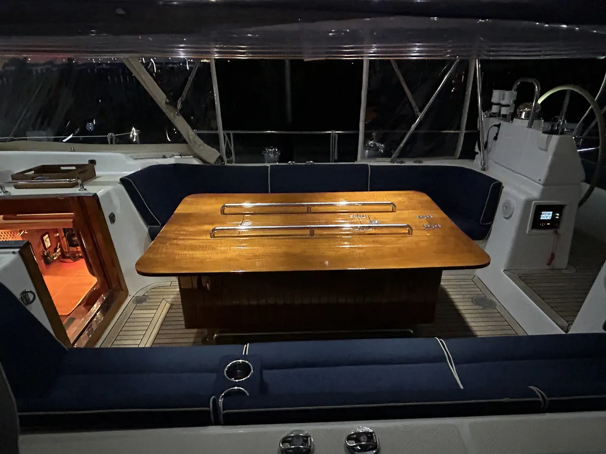 - All new belowdecks Ultraleather salon upholstery and cushions at settee, folding dining stools, starboard seats, chart table seat