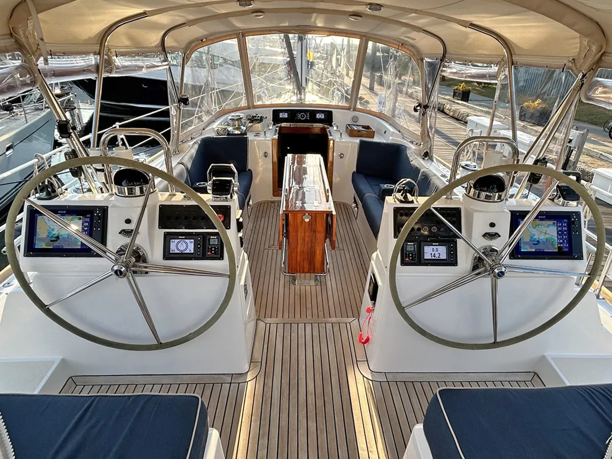 Aft and to starboard is an L-shaped forward facing navigation station with easy access to the cockpit. There is a comfortable pedestal chair along with multiple built-in backlit switch panels, navigation instruments and remote-control panels for the watermaker, system monitors and tank levels. The workspace also includes a lift-up chart table with custom storage and filing drawer, and a new safe was installed 2024.