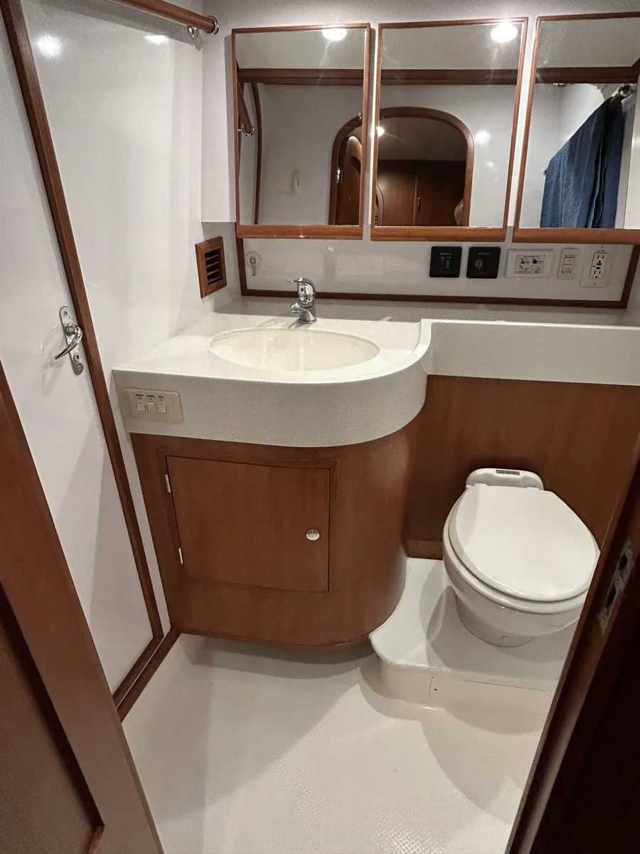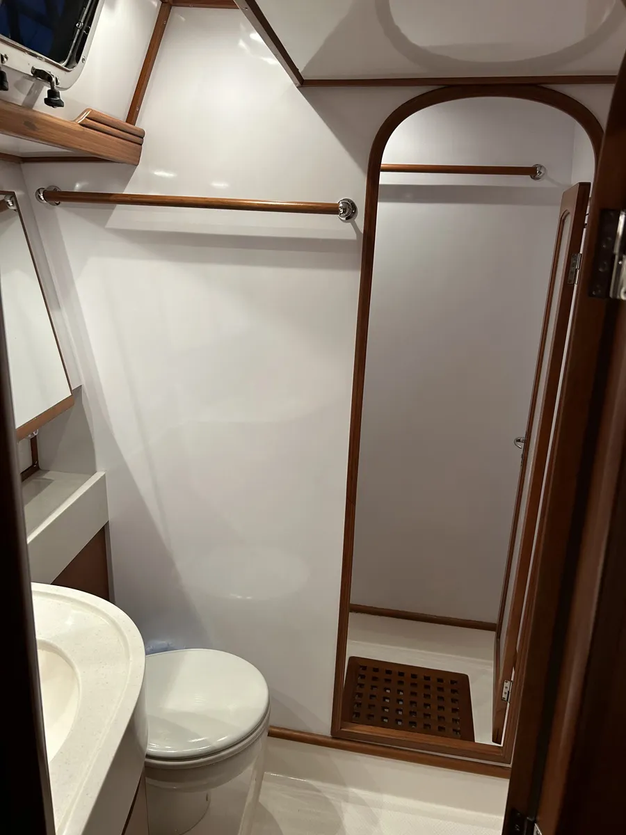 A private head with separate shower stall is found along the port side forward and features a Raritan freshwater electric toilet, Corian counters, vanity mirror and linen closet. There are two opening portholes.