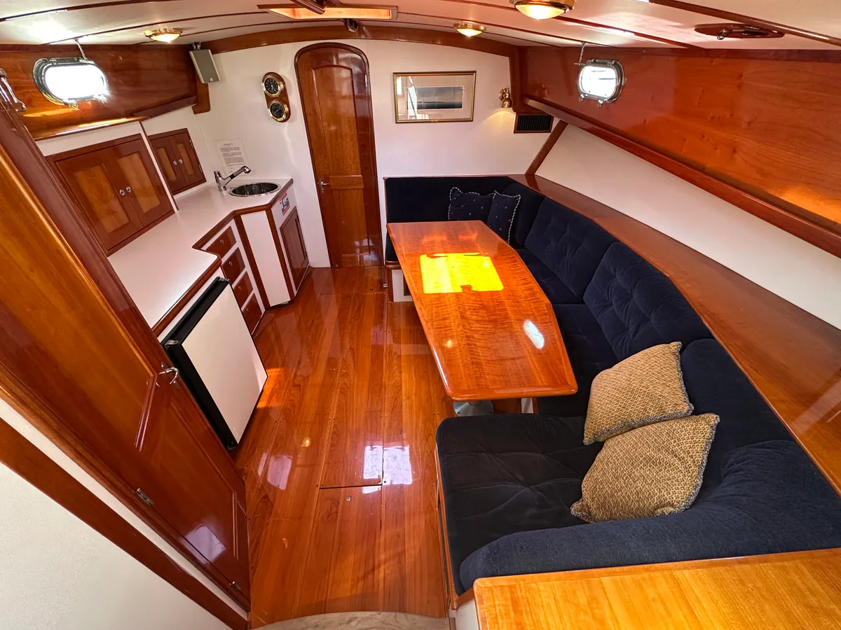 The main salon features a C-shaped settee and dinette to starboard with a gorgeous cherry table. Cushions are Navy Blue and complement the Herreshoff-style interior with white bulkheads accented by solid cherry trim and solid cherry panels on the inside of the deckhouse which frame multiple opening ports. The Galley is to port and forward with stainless sink, plenty of drawer storage, refrigeration and built-in microwave oven. Aft to port is the large and practical Head with proper stall shower and vanity with sink.