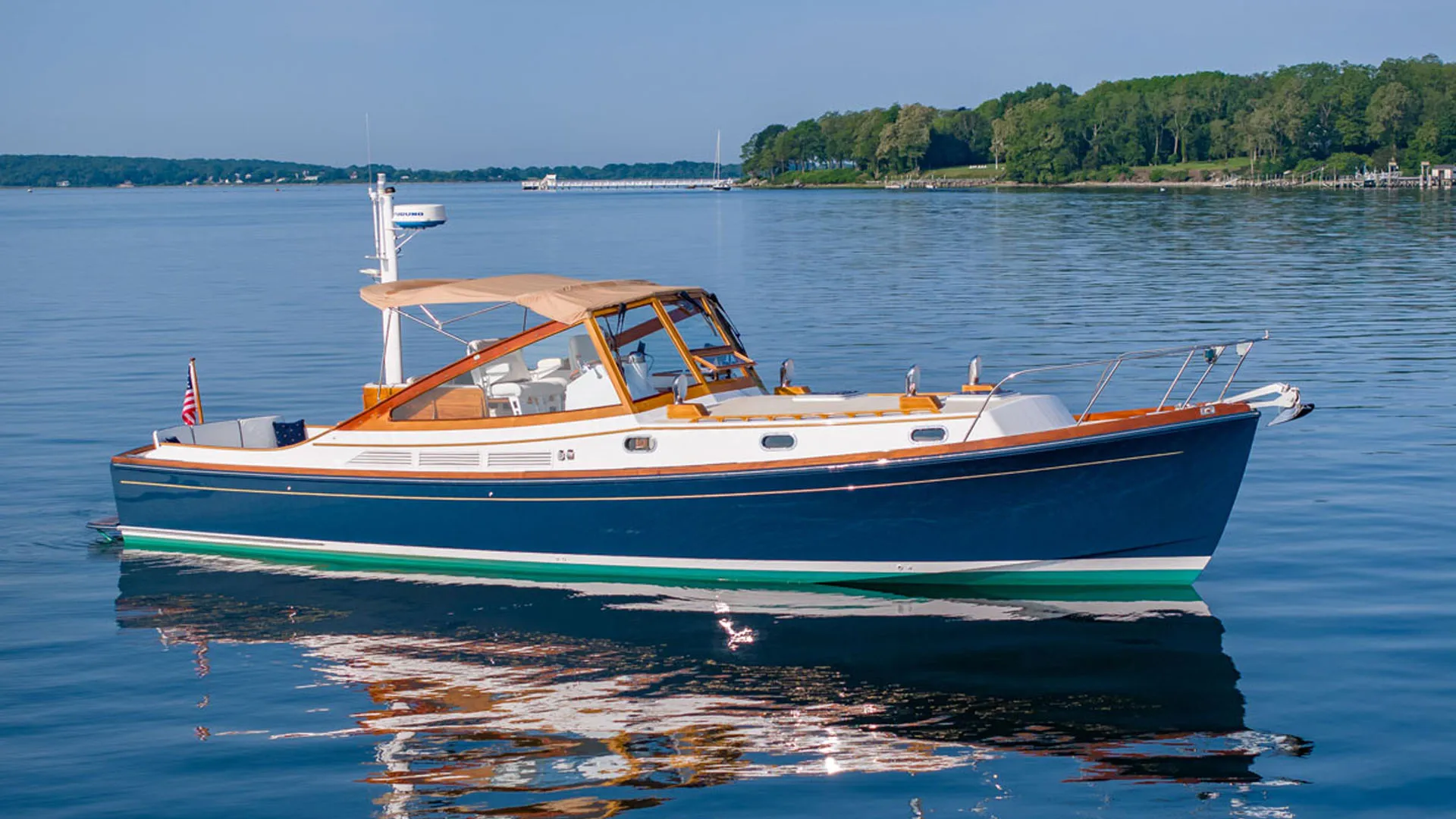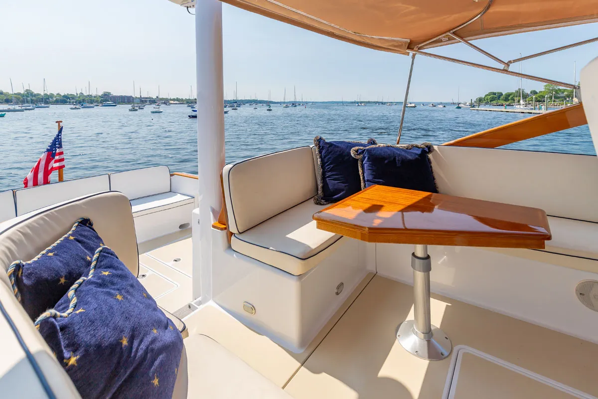 “Morris Blue” Awlgrip topsides with inset gold cove stripe, single white boot stripe and green bottom. Decks are Awlgrip “Off White” with contrasting “Moondust” Awlgrip sprayed nonskid. All exterior surfaces repainted in 2023. Exterior cushions in classic white with contrasting dark blue piping.