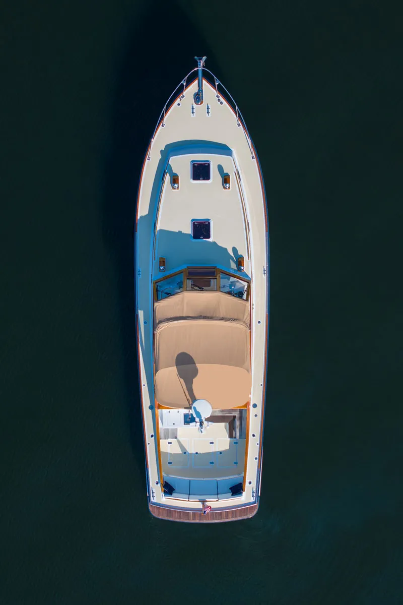 The Morris Wolf Class 44, one of the finest designs to spring from the boards of Paine Yacht Design, redefined the contemporary Maine express cruiser. Not a replica: she has sweeping lines, a distinctive profile and a smooth-riding hull. This 44-footer's Downeast origins are evident in the long, graceful profile and prominent, upturned bow- reminiscent and reflective of earlier Bunker and Ellis woodies built on Mount Desert Island years ago. The hull shape, however, is fully modern with a warped "V" with a very fine forward entry for wave penetration that flattens out to a 7.5 degree deadrise angle at the transom with “hard” chines to prevent roll and a partial skeg to provide excellent tracking as well as protection for the running gear. The result is better performance and fuel economy at lower speeds than a true deep "Vee” hull and a very smooth and capable ride at 27 knots when the going gets tough.