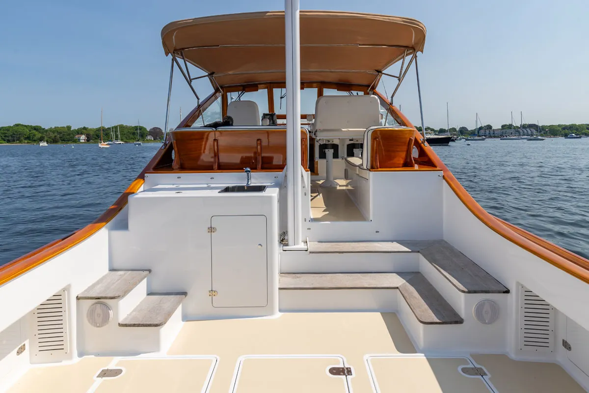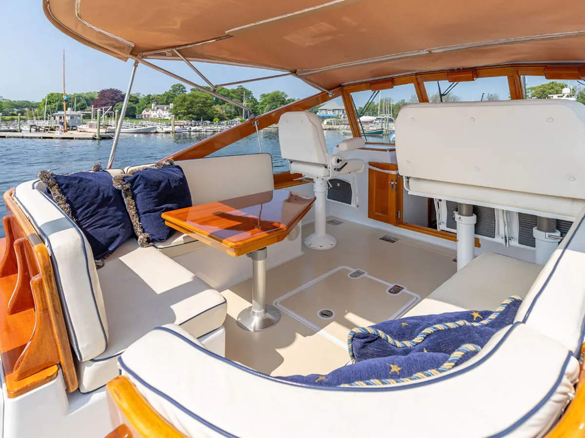 The cockpit features a built-in athwartship transom settee w massive solid teak backrest with storage beneath and a custom wetbar with large insulated ice box, stainless sink and cabinet storage. Generous L-shaped teak steps which are large enough to sit on provide access to the raised bridge deck as well as the side decks. Raised gunwales with varnished teak caps run the length of the cockpit for additional protection from any spray or water than makes it onto the deck.