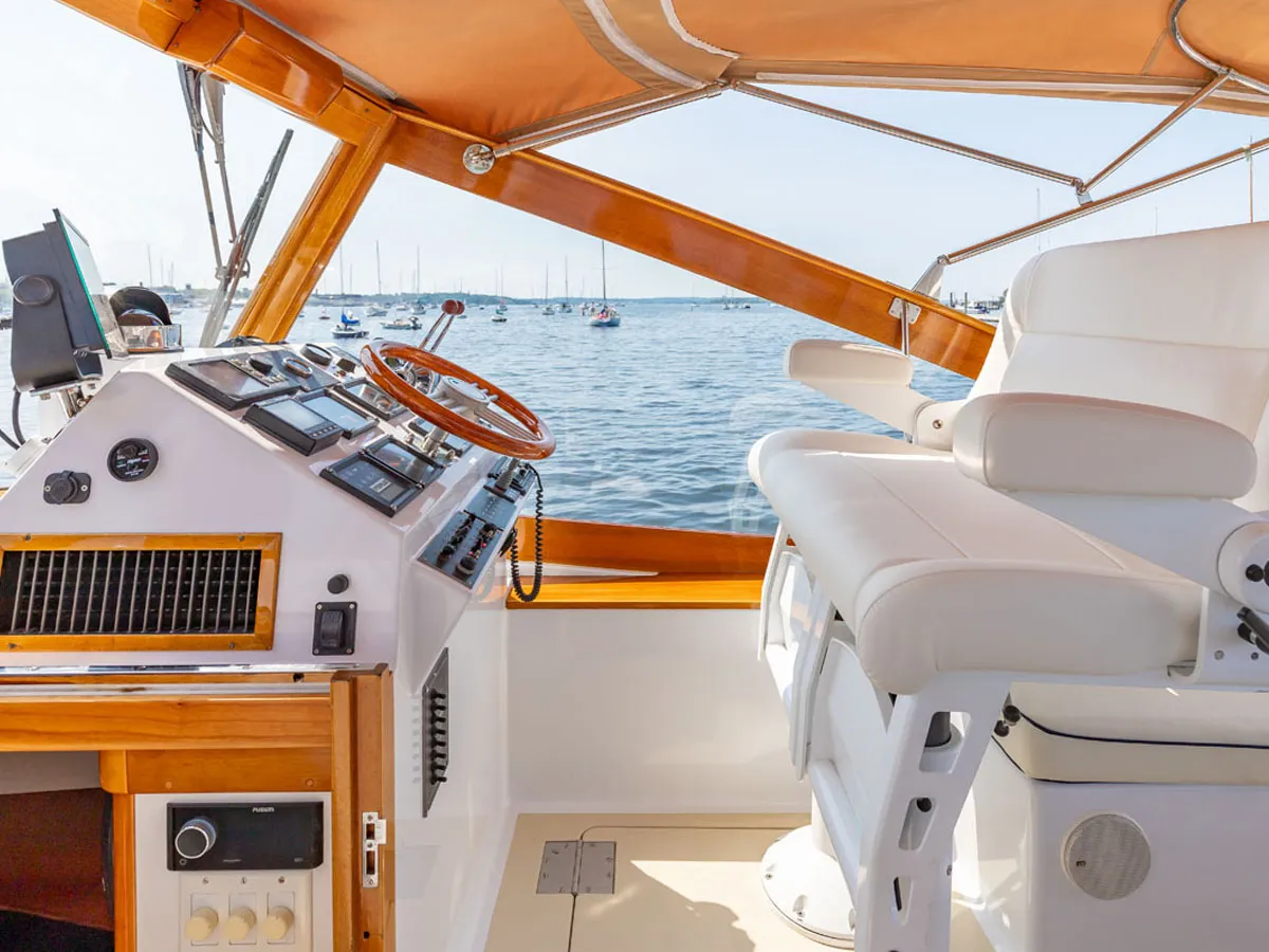 Befitting a high-caliber Maine-built boat, the cabin sole is constructed of solid wide-planed cherry with a gloss finish. Off white overheads with cherry accents and dome lights are found throughout the interior.