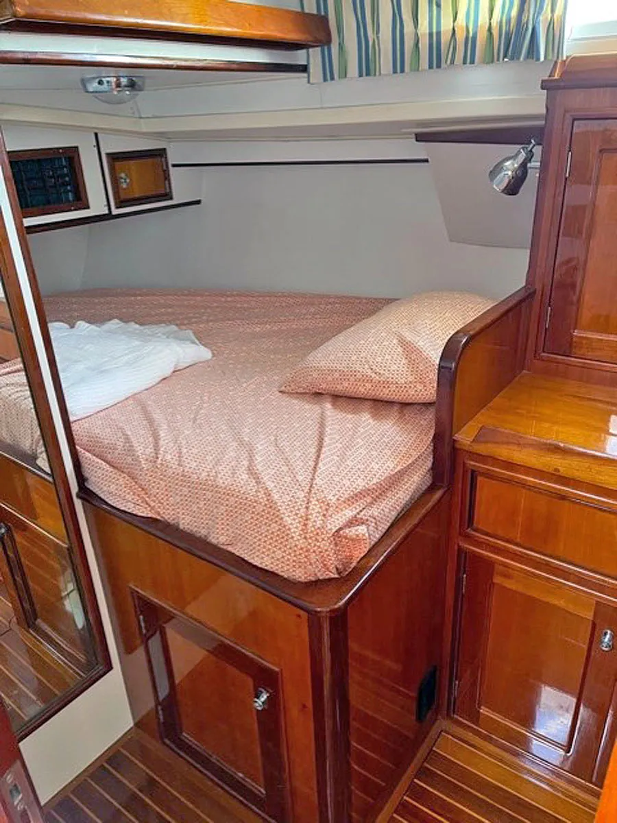 In the bow is a large sail and gear locker, very well laid out and approx. 6' in length. Aft of this is a collision bulkhead. The OWNER’S STATEROOM is in the forward part of the vessel, beautifully arranged, extremely light, airy and well ventilated. There is a centerline queen berth, extensive drawer storage and a small settee, linen storage locker and book storage. Aft to starboard is a cedar-lined hanging locker; further aft is a mirrored vanity with swing-out seating, drawer and hair dryer storage locker. The OWNER'S HEAD is to port, beautifully finished in cherry with Corian countertops, small bath tub and shower aft, stainless steel bidet, Mansfield electric head and teak grate.