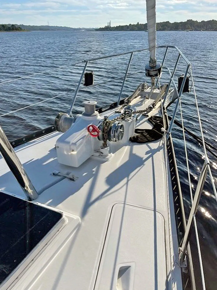 On the foredeck the anchoring system is exceptional, with two large CQR anchors in chocks, the windlass further aft, and excellent deep storage lockers both port and starboard of the sail locker. There is a large lazarette aft.