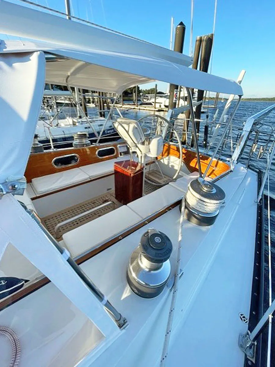 Up the companionway is the large aft cockpit. There is a large cockpit table with centerline foot rest. The cockpit is protected by a dodger and a bimini that can be united. There is engine room access under the starboard seat.