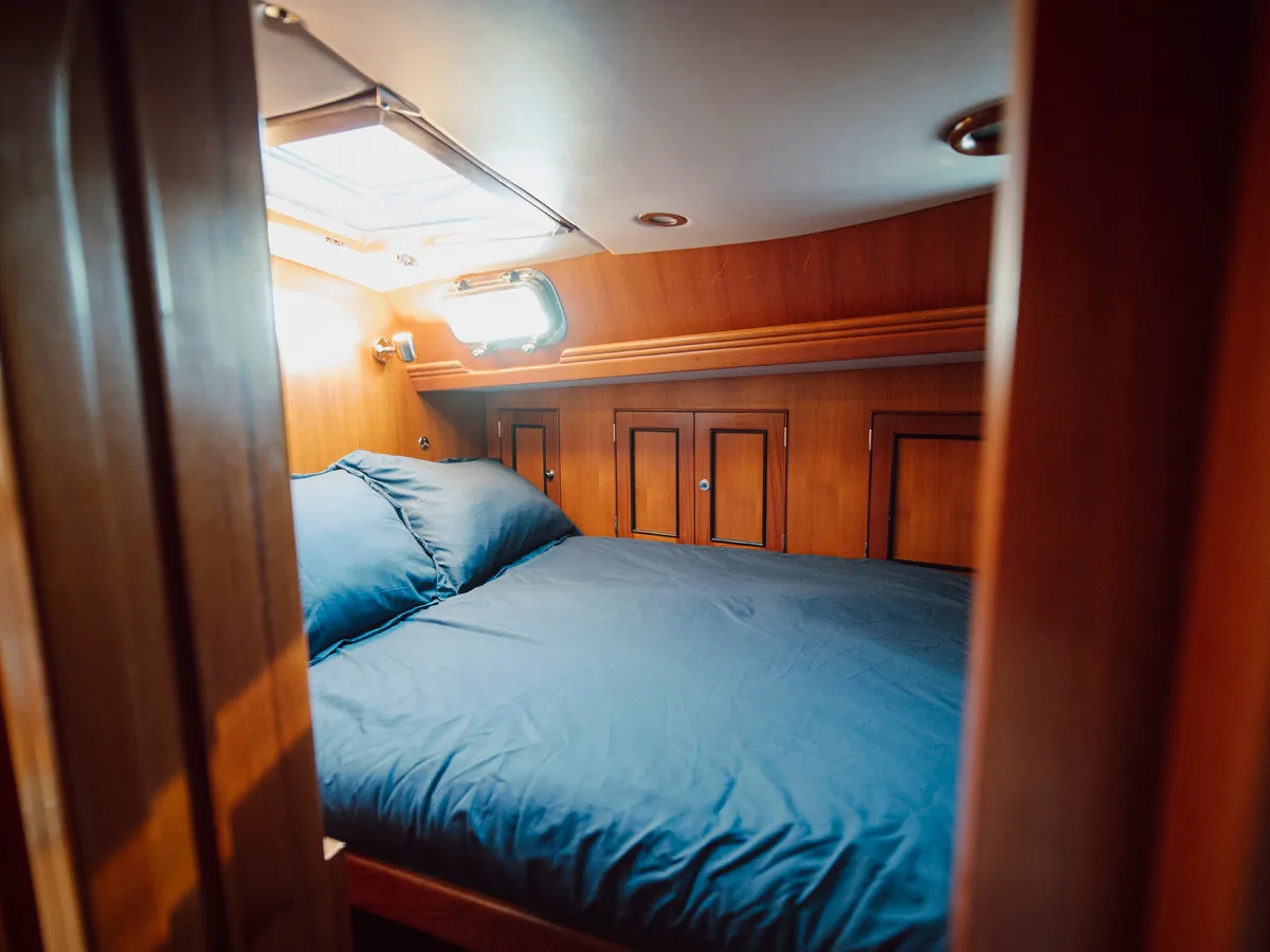 INTERIOR The raised center cockpit of the H54 allows for a class-leading interior volume with an enormous salon that opens to the galley & nav station, deck-height windows for natural light and ventilation, and three well-appointed cabins. The beam-wide owner’s stateroom is aft and benefits from a king-sized berth, ensuite head with stall shower, ample light and ventilation, and plenty of storage. The standard settee was eliminated in exchange for more storage lockers. There is a flat screen TV on the forward bulkhead with a huge hanging locker below. There are his-and-hers lockers and drawers on either side of the stateroom. Going forward through the forward passageway there is another large stateroom in the bow (queen-sized berth), and a guest cabin to port with a double/single convertible berth that can double as a work bench. These two cabins share a well-appointed head, also with an ensuite stall shower. All cabinetry and doors are teak with an ebony inlay. The passageway doors have squared bases at the bottom and rounded corners on top. The soles throughout are bamboo with teak inlay. There is a double-grooved design element around the main salon, galley and cabin fiddles. There is teak facia along the coachroof throughout all cabins including the main salon and galley. Beautiful Giallo California Granite Counters were used in the galley. The upholstery is UltraSuede.