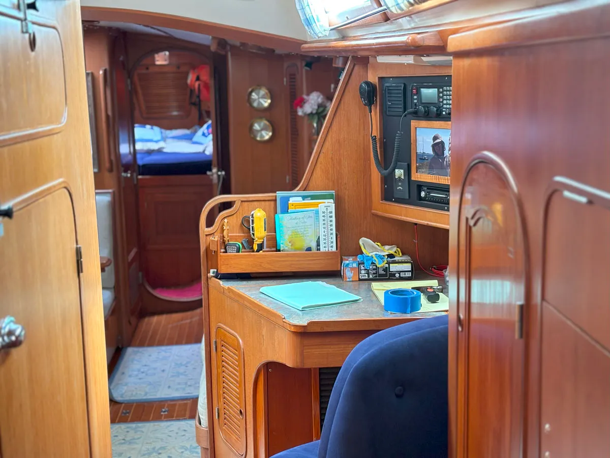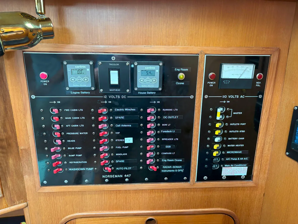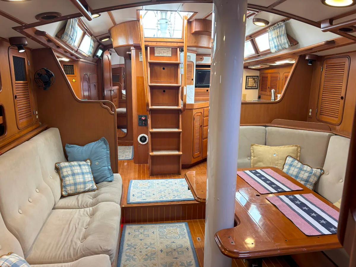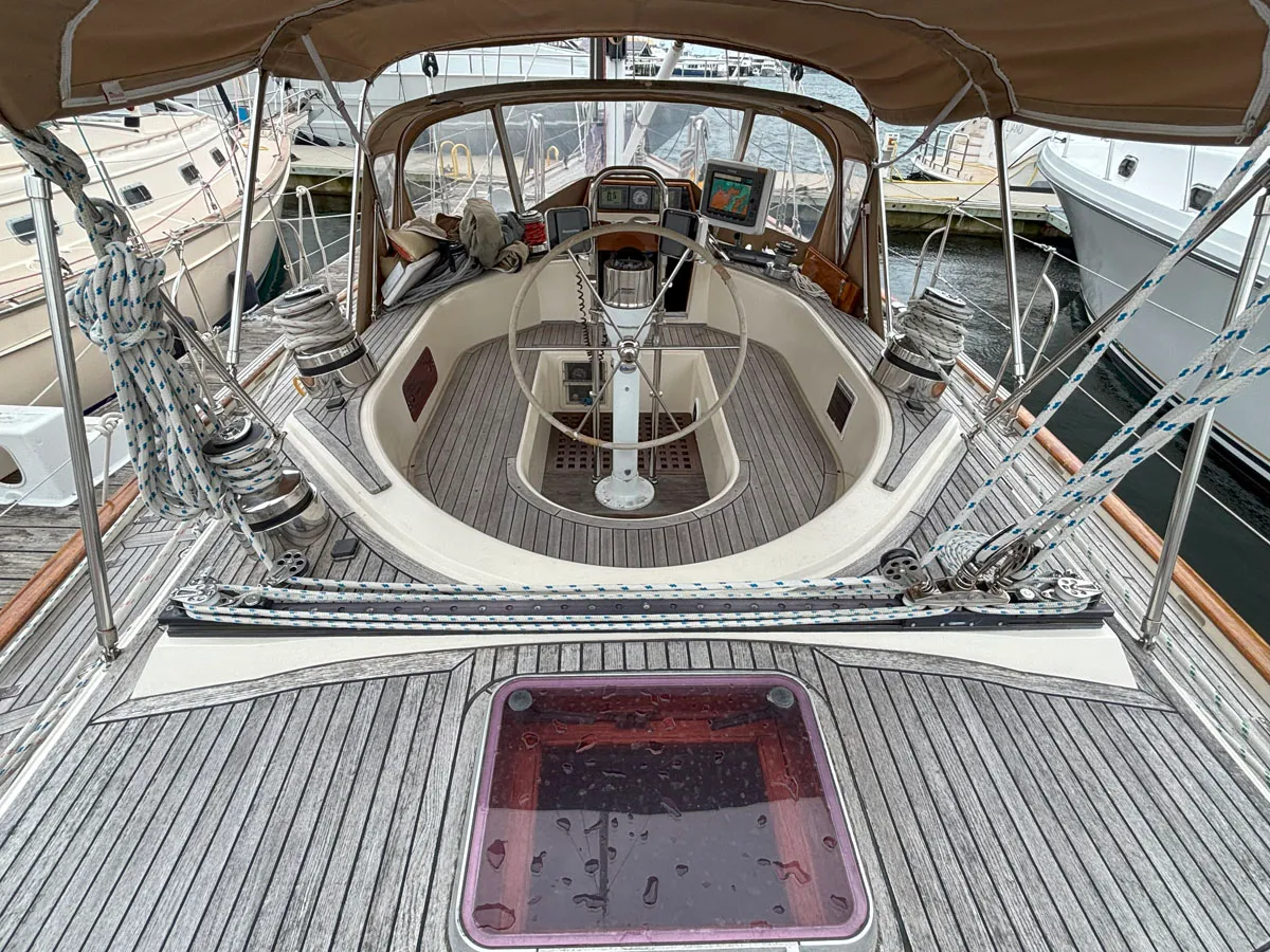 DESCRIPTION The Norseman 447 is solid and reliable bluewater cruiser that has provided its current owners years of safe passagemaking and comfortable evenings of relaxation at anchor. The center cockpit offers great visibility and ease of handling with its furling mainsail and genoa along with its control lines leading to the cockpit. The bimini and dodger offer great protection from the elements. A large-screen chart plotter and sailing instruments allow for convenient navigation. Down below is a cozy main salon with a dining table and seating area, along with a spacious galley to cook meals. The nav station provides ample space for chart work and communications with the breaker panel within easy reach. The aft cabin comfortably sleeps two in a double bed; deck hatches and transom windows give great natural lighting. Connected to this cabin is an ensuite head and shower. A second cabin forward gives a guest or two adequate sleeping quarters and plenty of storage space. This Norseman 447 is ready for your adventures to begin. DESIGN & CONSTRUCTION SEA EAGLE is a Robert Perry designed Norseman 447. The hull is a monolithic construction made of fiberglass with an Airex foam core. The deck also monolithic fiberglass laid up with a balsa core. The deck is bonded and fastened to the hull and includes a through bolted toe rail. The teak decks are glued and fastened to the outer layer of fiberglass. The interior bulkheads are constructed out of marine plywood laminated into place for structural integrity. ACCOMMODATIONS Main Salon