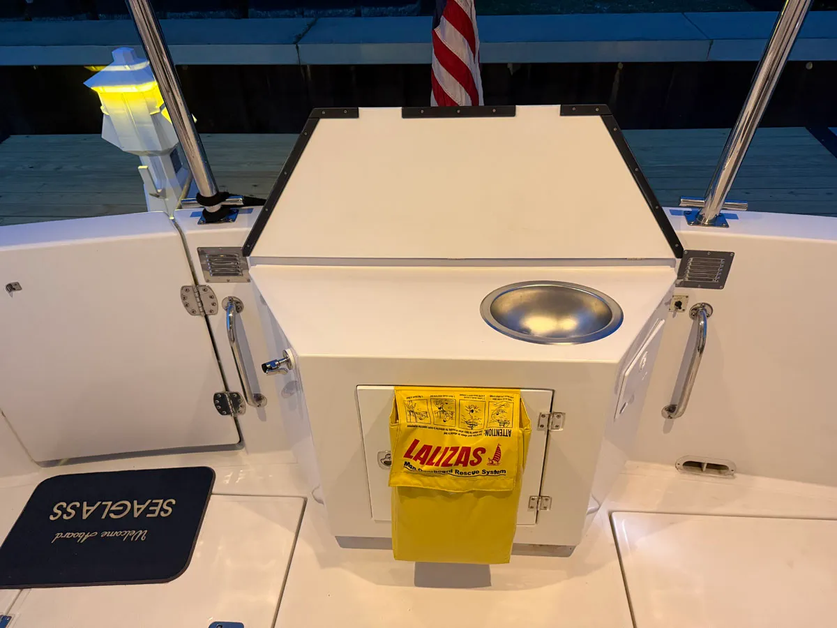 - Garmin camera on aft deck, displayed at helm for rear-view while docking