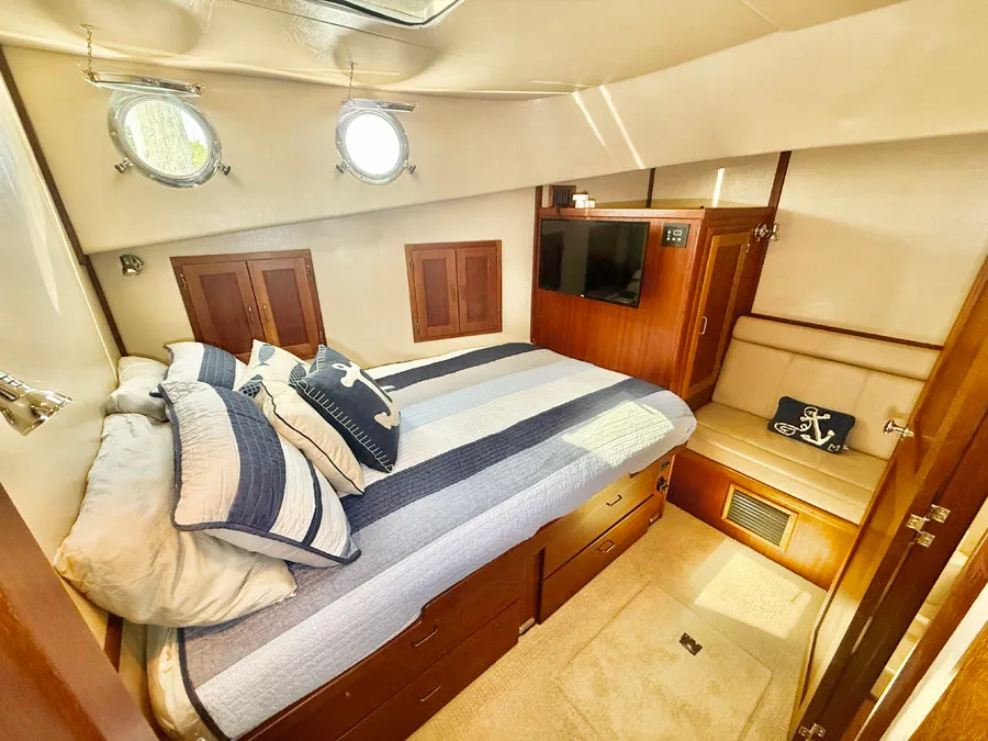 Returning to the upper landing you find the SeaVac central vacuum hookup outboard. Turning to port are steps down to the lower-level landing where the owner’s cabin is located through the door, aft. At the bottom of the steps and forward is the Splendide 2000 washer and dryer located in a dedicated locker at the bottom of the steps and outside the owner’s cabin door. Stepping into the large owners cabin you will find: