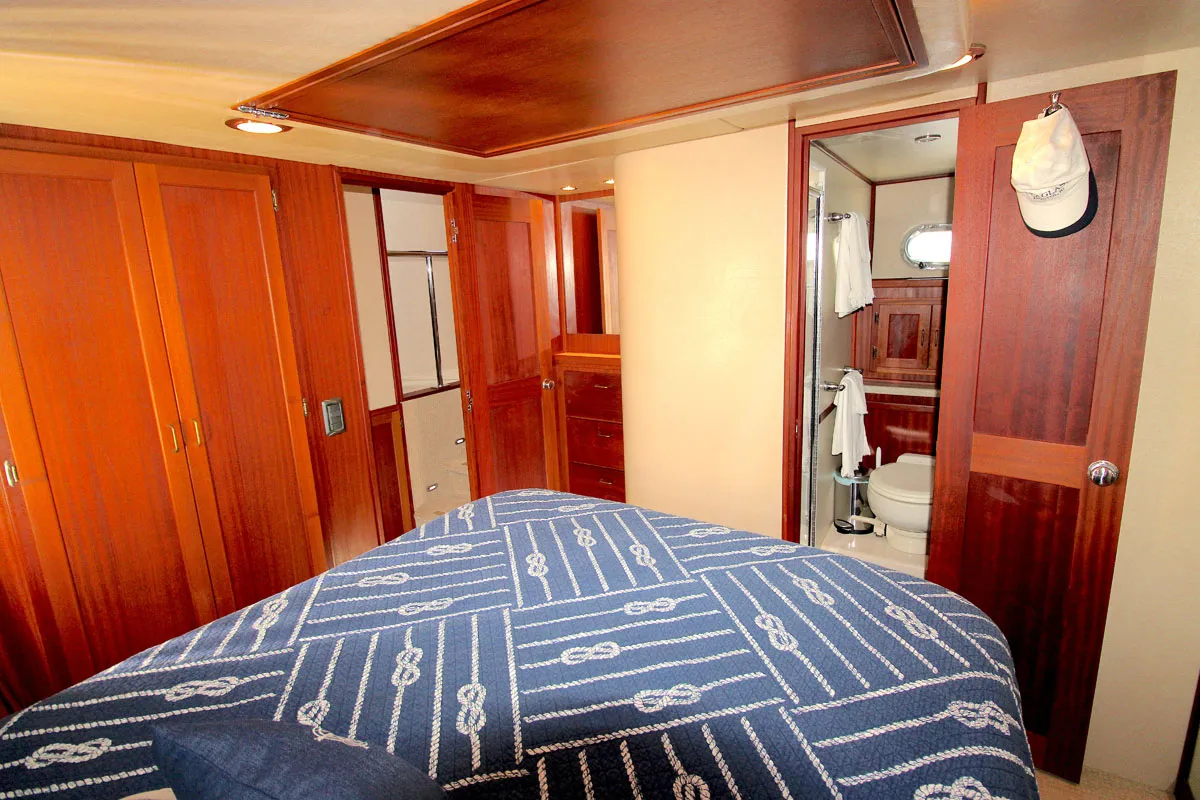 - Opposite the athwartships double bunk in the owner’s cabin is the owners head, featuring: