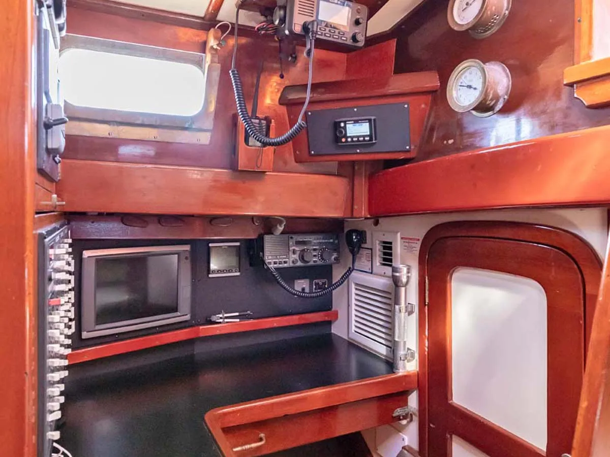 The navigation station is to starboard with a full complement of updated electronics. This is a snug spot for the navigator, situated next to the companionway leading up to the cockpit.