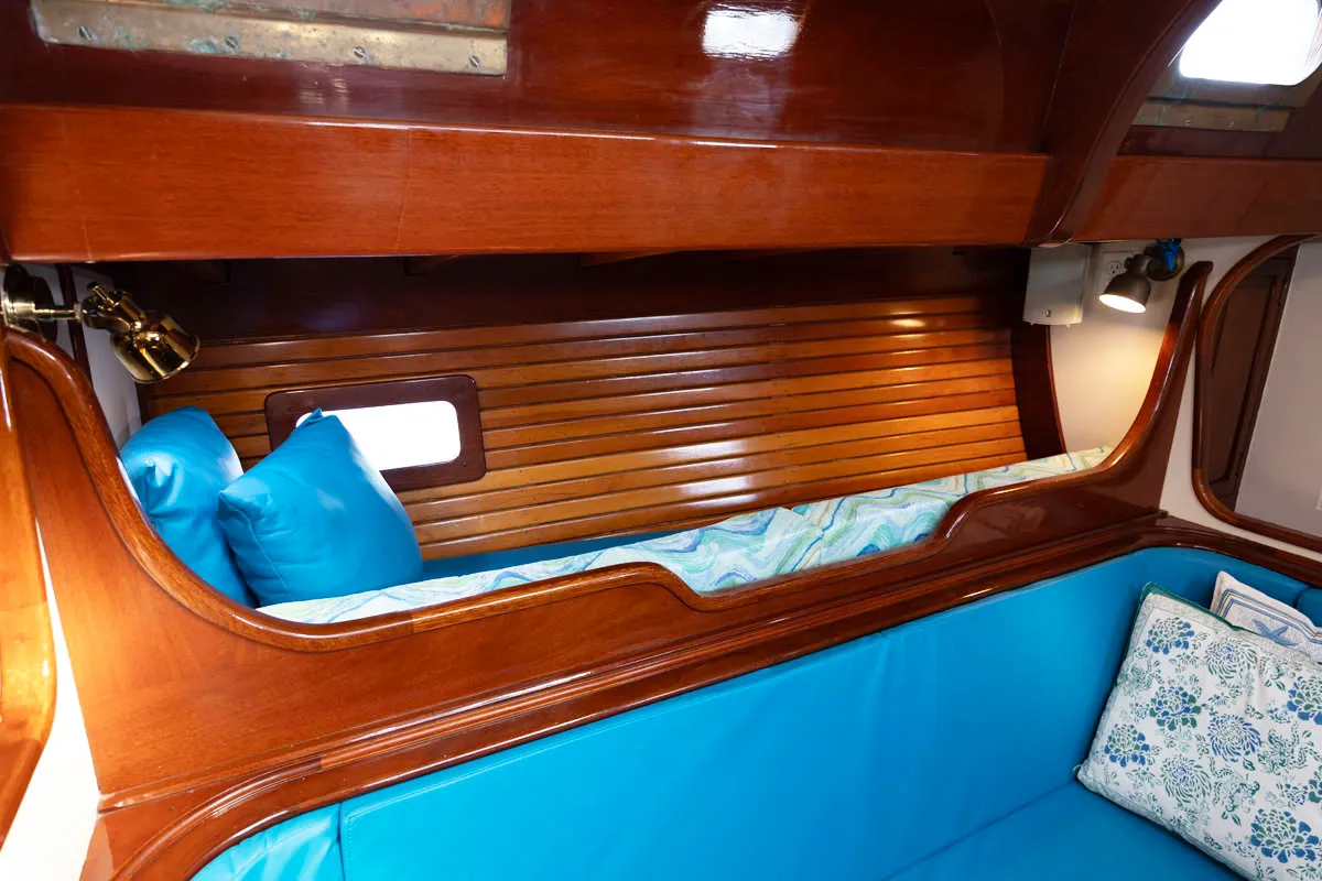 Aft of the mast is the spacious salon which features a lovely mahogany table (center storage and matching lift-outs) with folding leaves, and a shallow U-shaped settee to port. A snug offshore-ready pilot berth is outboard to port, with its own non-opening hull port for light and a view. Across from the table to starboard is a straight settee that doubles as an additional sea berth with lee cloth. Outboard and above there is an open shelf with another hull port, with hull staving in a lighter wood that takes advantage of the full beam of the yacht and adds a nice contrast to the darker joinery. Bronze plaques from the Dunhill San Fernando Race in 1995 and the South China Sea Race in 1996 attest to the true globetrotting nature of this capable design and the miles NARWHAL cruised in her “early teens”!