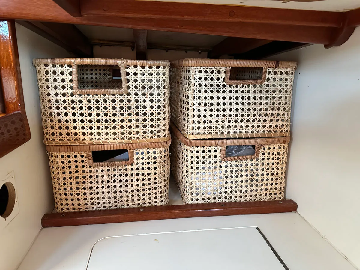 Across from the galley to starboard is another huge insulated icebox with shelf on top. A good-sized hanging locker is just forward, also with storage on top and large shelf above.