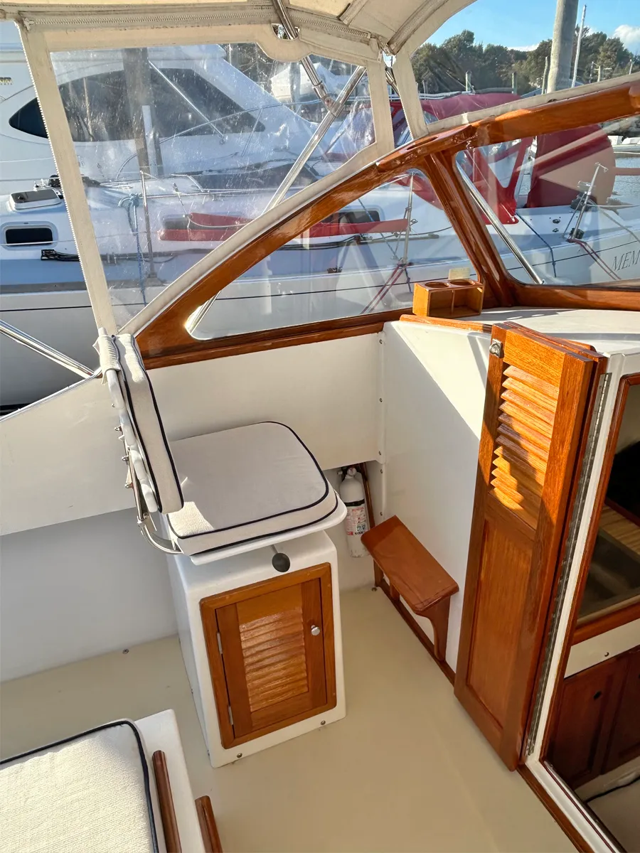 - Pompanette helm and passenger seats (new cushions 2022) with storage locker port side under seat