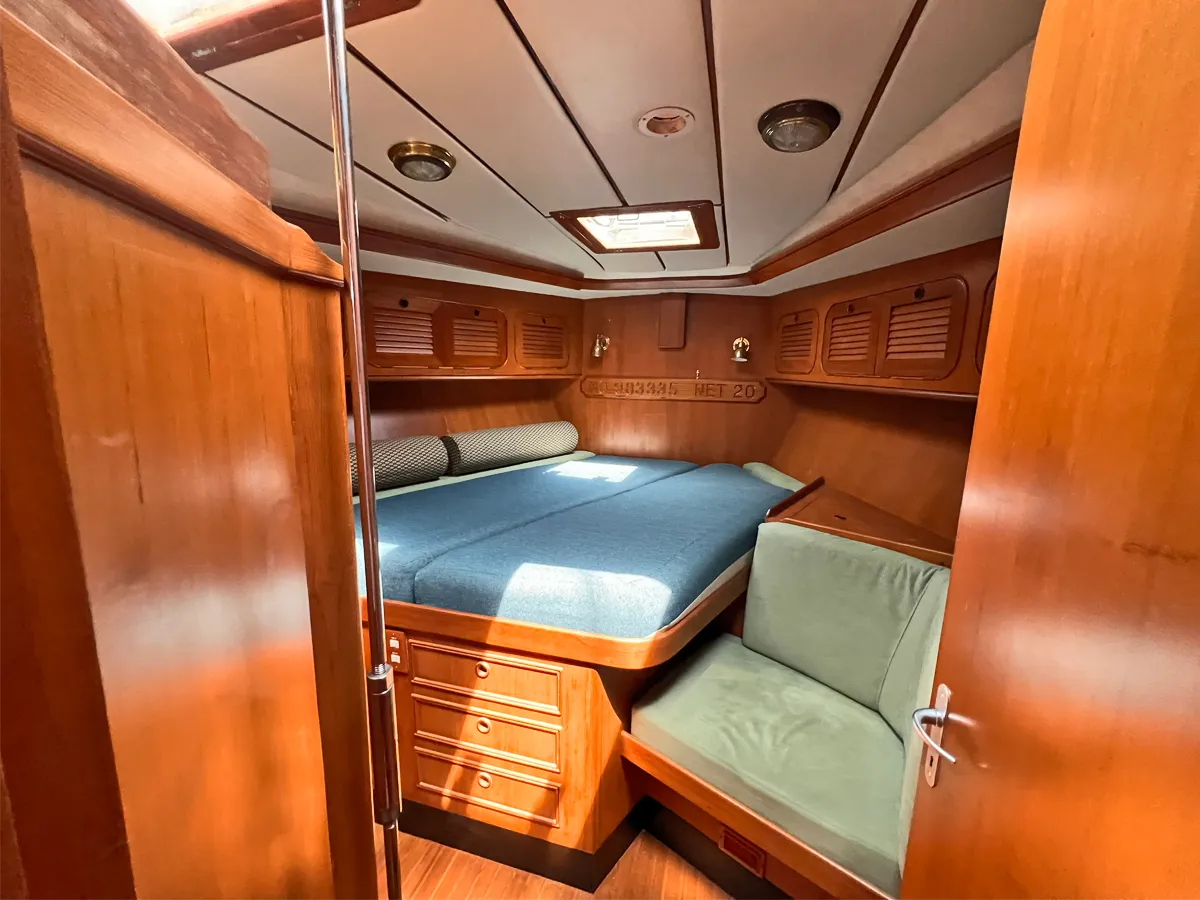 Dual passageways lead aft from the Nav area and galley to the owner’s cabin, which features a centerline queen-sized berth that can be divided for use at sea. There are two large hanging lockers plus numerous drawers and storage lockers. A small vanity is to starboard with a seat to port. A large deck hatch, three opening portholes and electric fan provide ventilation that is further enhanced by the dual passageways.