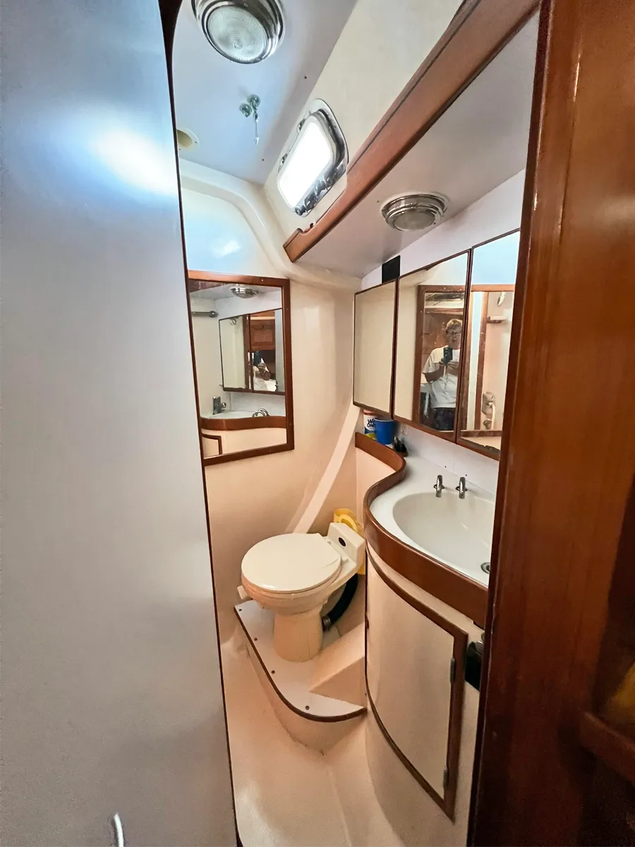 The forward head is further aft to port and features a Vacuflush toilet, Corian countertops and a separate stall shower. Toilet discharge is direct overboard or into a 40-gallon holding tank.