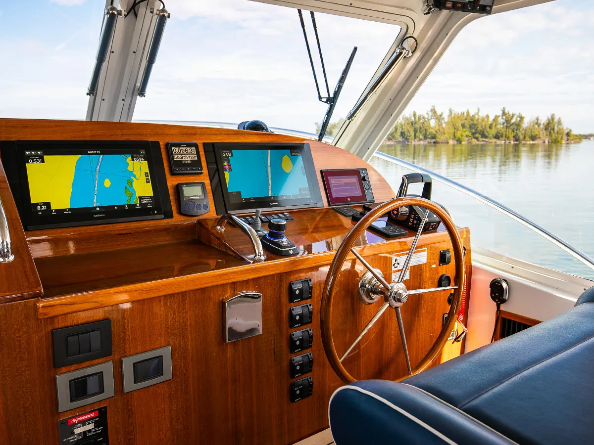 - Optional helm and co-pilot dash and countertops in gloss finished teak with flush mounted electronics