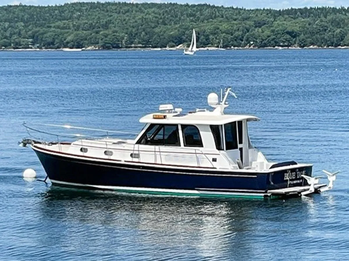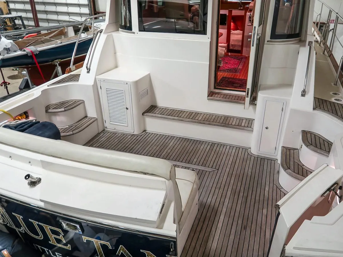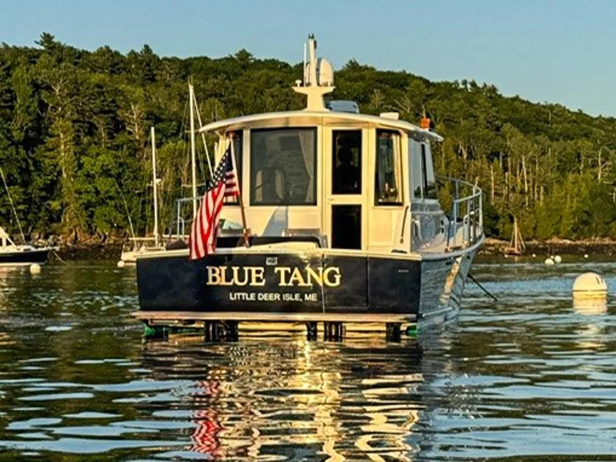 BLUE TANG is a stunning example of the popular Eastbay 39SX built by Grand Banks. She has been meticulously maintained and in recent years has been used lightly in Maine summers and stored inside for the winter. Her enclosed pilothouse provides excellent visibility with protection from the elements and is climate controlled if needed. Below a simple open layout with a centerline berth in the forward cabin, a simple galley and dinette and a head with separate shower provide everything needed for coastal cruising. The cockpit provides outside seating with a transom door to a swim platform with a Freedom dinghy lift for easy tender storage.