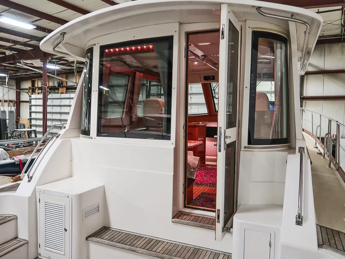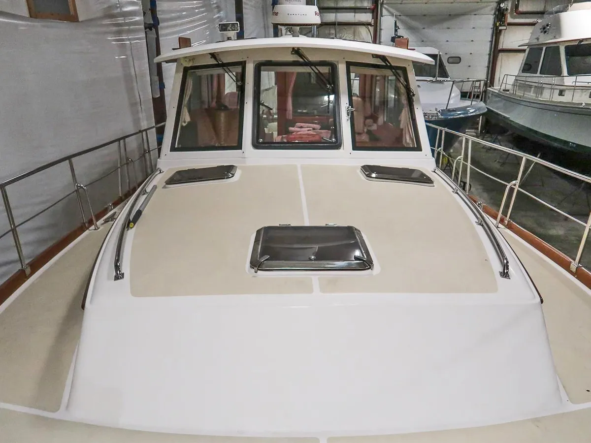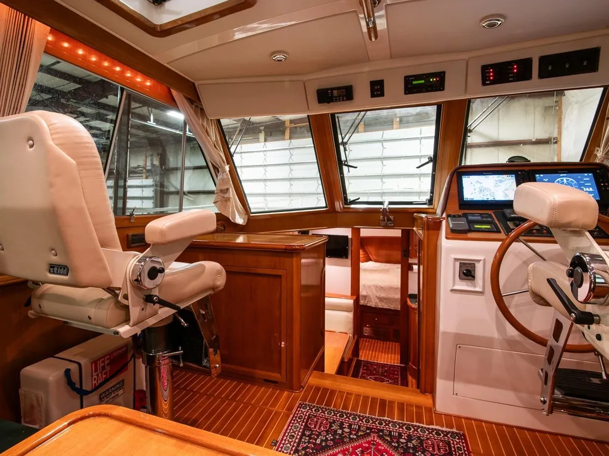 BLUE TANG is a stunning example of the popular Eastbay 39SX built by Grand Banks. She has been meticulously maintained and in recent years has been used lightly in Maine summers and stored inside for the winter. Her enclosed pilothouse provides excellent visibility with protection from the elements and is climate controlled if needed. Below a simple open layout with a centerline berth in the forward cabin, a simple galley and dinette and a head with separate shower provide everything needed for coastal cruising. The cockpit provides outside seating with a transom door to a swim platform with a Freedom dinghy lift for easy tender storage.