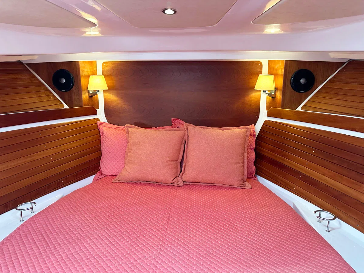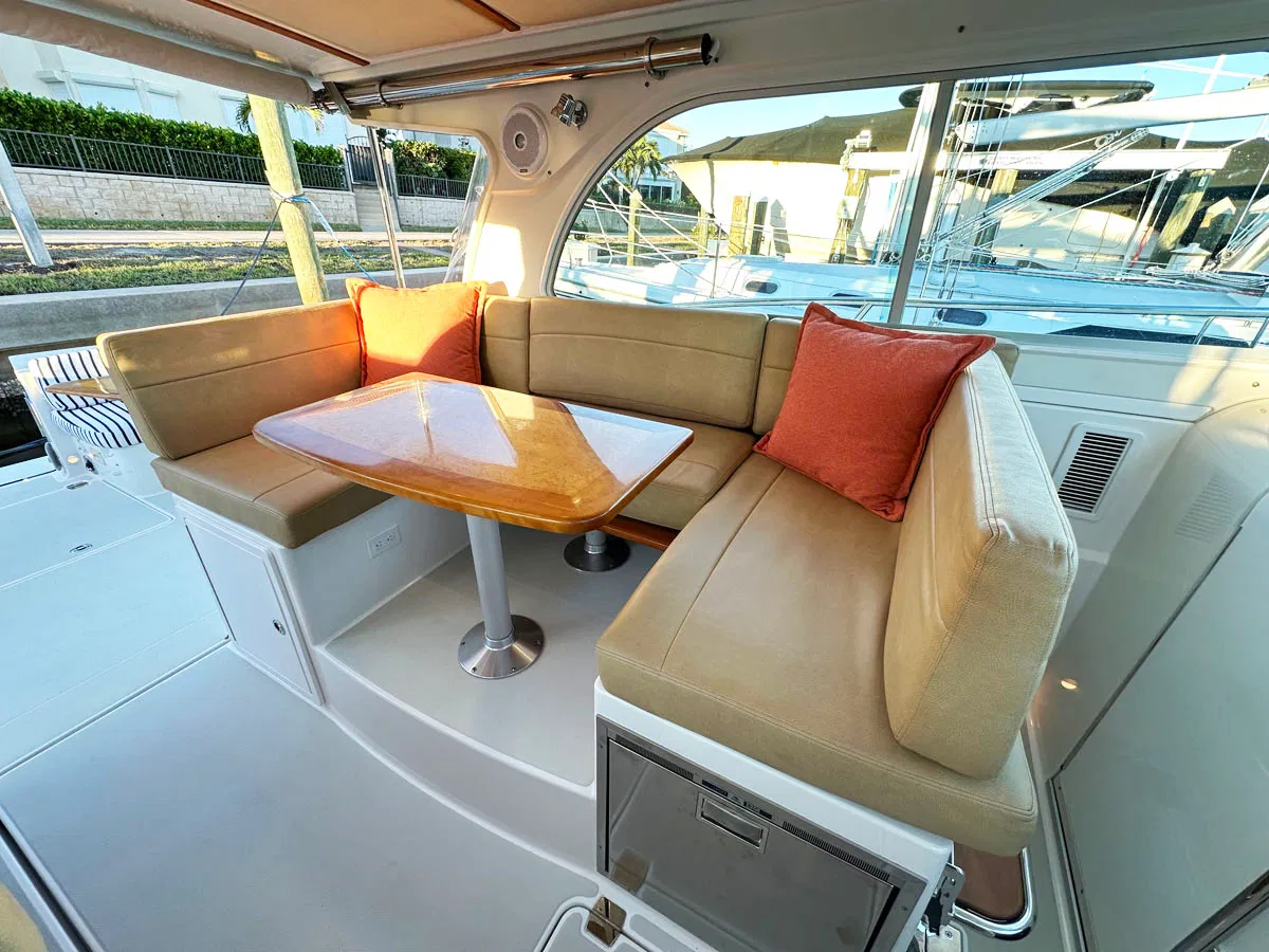The layout has the helm station all the way forward & to starboard. The helm station guest seating is to port. The galley is aft of the helm station and also to starboard. Opposite is the settee / dinette area. It converts to a double berth (note: measures 48″ wide x 90″ long without the vertical cushions in-place).